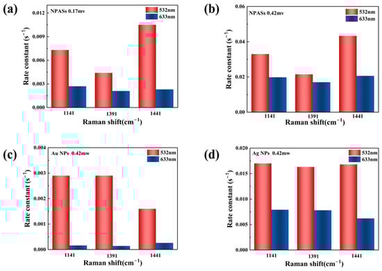 Comparison of apparent reaction rate constants (k) for different substrates under varying excitation conditions. (a) NPASs (0.17 mW); (b) NPASs (0.42 mW); (c) Au NPs (0.42 mW); (d) Ag NPs (0.42 mW). Red bars represent 532 nm excitation; blue bars represent 633 nm excitation.