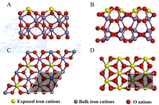 Atomic configuration and site density regulation on specific hematite facets. (A,C) Side and top views of the stoichiometric (001) facet, and (B,D) side and top views of the (012) facet. Yellow spheres represent coordination-unsaturated surface iron sites, while blue and red spheres denote bulk iron and oxygen atoms, respectively. The specific atomic arrangement determines the density and coordination state of active sites, directly impacting the energetic span of H2O2 activation. Reproduced with permission from Ref. [120], Copyright (2019) American Chemical Society.