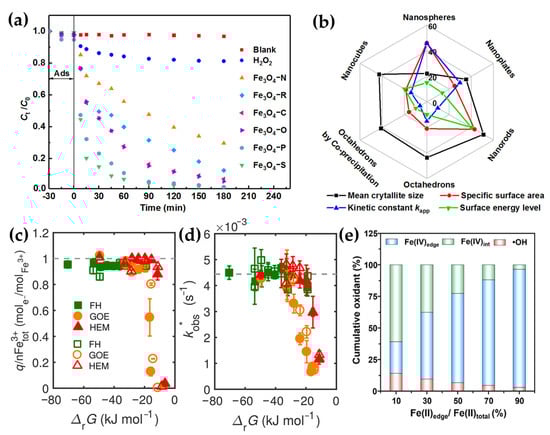 In the microkinetics of heterogeneous Fenton reactions, electron transfer serves as the central driving force for H2O2 activation and O-O bond cleavage. The regulation of Fenton performance by phase structure is fundamentally achieved through changes in the surface electron density, the thermodynamic barrier for Fe(III) reduction, the selectivity of electron-transfer pathways, and the efficiency of bulk charge transport. Since the reduction in Fe(III) to Fe(II) typically constitutes the kinetic bottleneck in the Fenton cycle, the intrinsic density of Fe(II) within the phase structure directly dictates the initial reaction rate. Zhong et al. (2017) [123] elucidated this structure-activity relationship in their study on the facet effect of magnetite (Fe3O4): compared to (100) and (110) facets, the (111) facet of magnetite crystallographically tends to terminate in Fe(II)-rich octahedral sites, as reflected in the facet-dependent activity map (Figure 3a,b). This high density of surface Fe(II) acts as an intrinsic electron donor, enabling H2O2 to undergo rapid single-electron reduction to generate HO•, thereby eliminating the reduction induction period [123]. For hematite (α-Fe2O3), which intrinsically lacks Fe(II), Wu et al. (2023) [124] demonstrated that specific micromorphologies (such as leaf-like structures) can stabilize a higher proportion of surface Fe(II) species as a result of differences in crystal growth kinetics. This morphology-induced surface valence reconstruction directly accelerates the Fe(III)/Fe(II) redox cycle, establishing a positive correlation between surface electron density and macroscopic reaction rates [124].