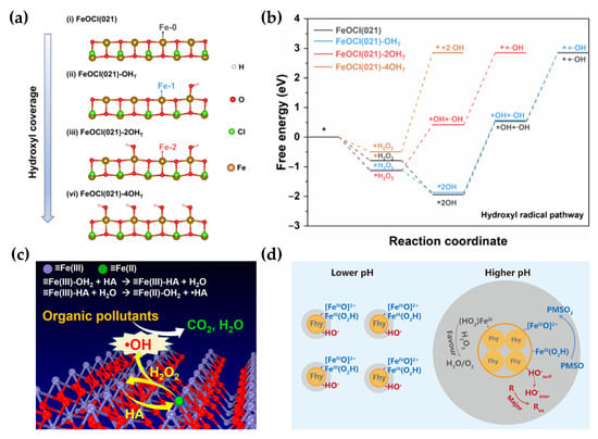 Surface hydroxyl groups function as the primary binding sites for H2O2 via ligand exchange mechanisms, and their density and electronic configuration are critical determinants of the reaction pathway. Al-Ahmari et al. demonstrated that goethite possesses a significantly higher density of reactive hydroxyl species than hematite, which directly correlates with an enhanced capacity for oxidant adsorption. Beyond site density, the surface coverage and electronic nature of these hydroxyls modulate the stability of the precursor complex [128]. Chen et al. (2025) [129] elucidated how the specific coverage of terminal hydroxyls on the FeOCl (021) facet dictates the energetic span of H2O2 activation. Their DFT calculations demonstrated that a specific local chemical state, such as 50% terminal hydroxyl coverage, significantly lowers the energetic barrier for O–O bond cleavage compared to pristine or fully hydroxylated surfaces (Figure 4c,d). This indicates that the surface state stabilizes the adsorbate in a configuration that energetically favors reactive oxygen species generation over desorption [129].