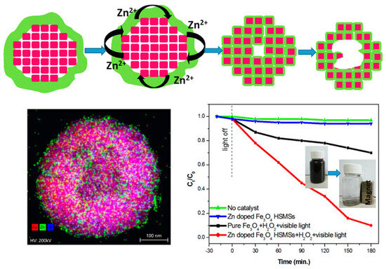 - Nguyen, X.S.; Zhang, G.; Yang, X. Mesocrystalline Zn-Doped Fe3O4 Hollow Submicrospheres: Formation Mechanism and Enhanced Photo-Fenton Catalytic Performance. ACS Appl. Mater. Interf. 2017, 9, 8900–8909. [Google Scholar] [CrossRef]