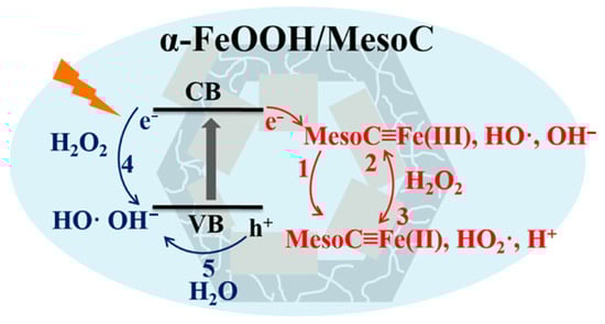 - Qian, X.; Ren, M.; Zhu, Y.; Yue, D.; Han, Y.; Jia, J.; Zhao, Y. Visible Light Assisted Heterogeneous Fenton-Like Degradation of Organic Pollutant via α-FeOOH/Mesoporous Carbon Composites. Environ. Sci. Technol. 2017, 51, 3993–4000. [Google Scholar] [CrossRef]