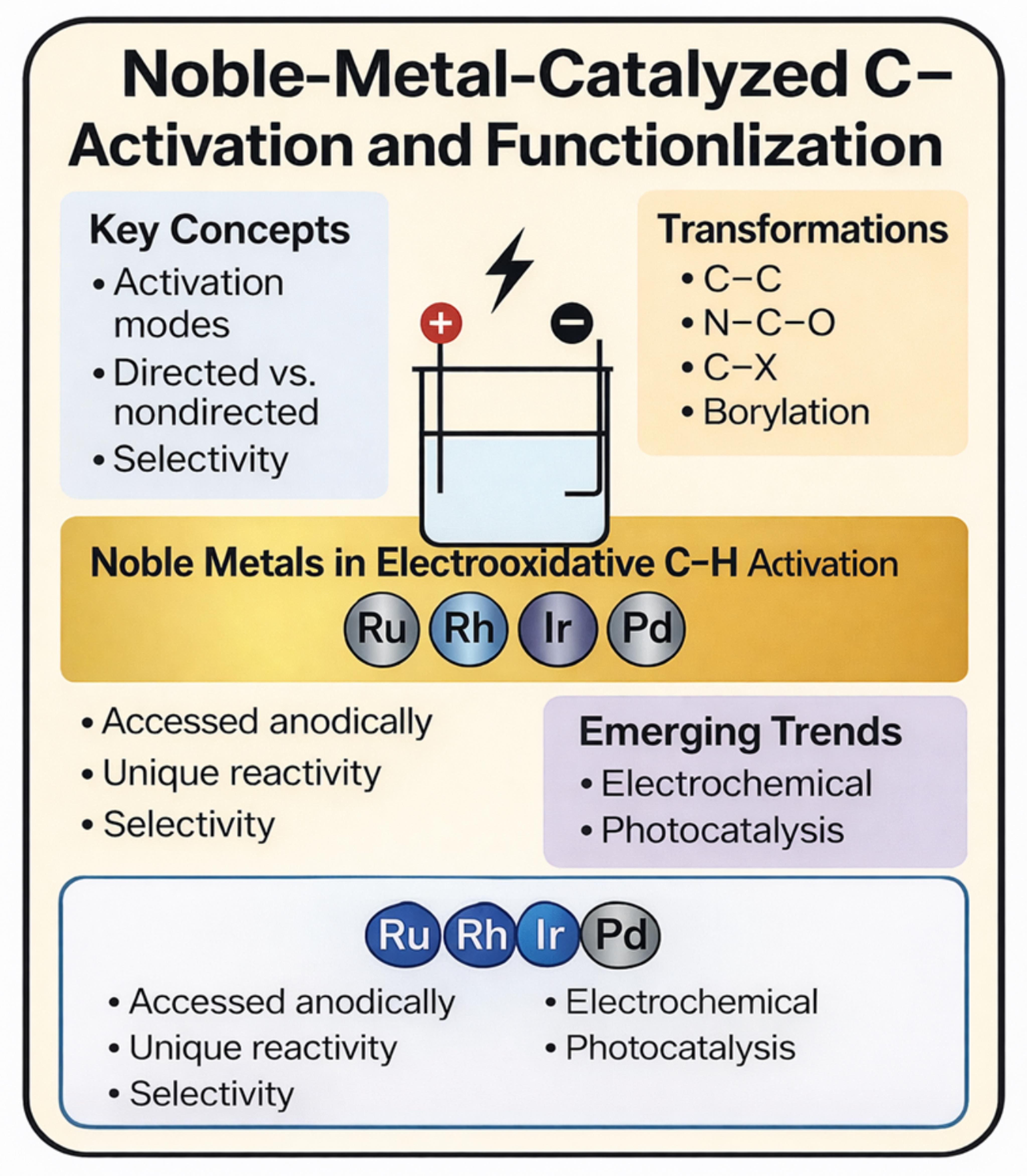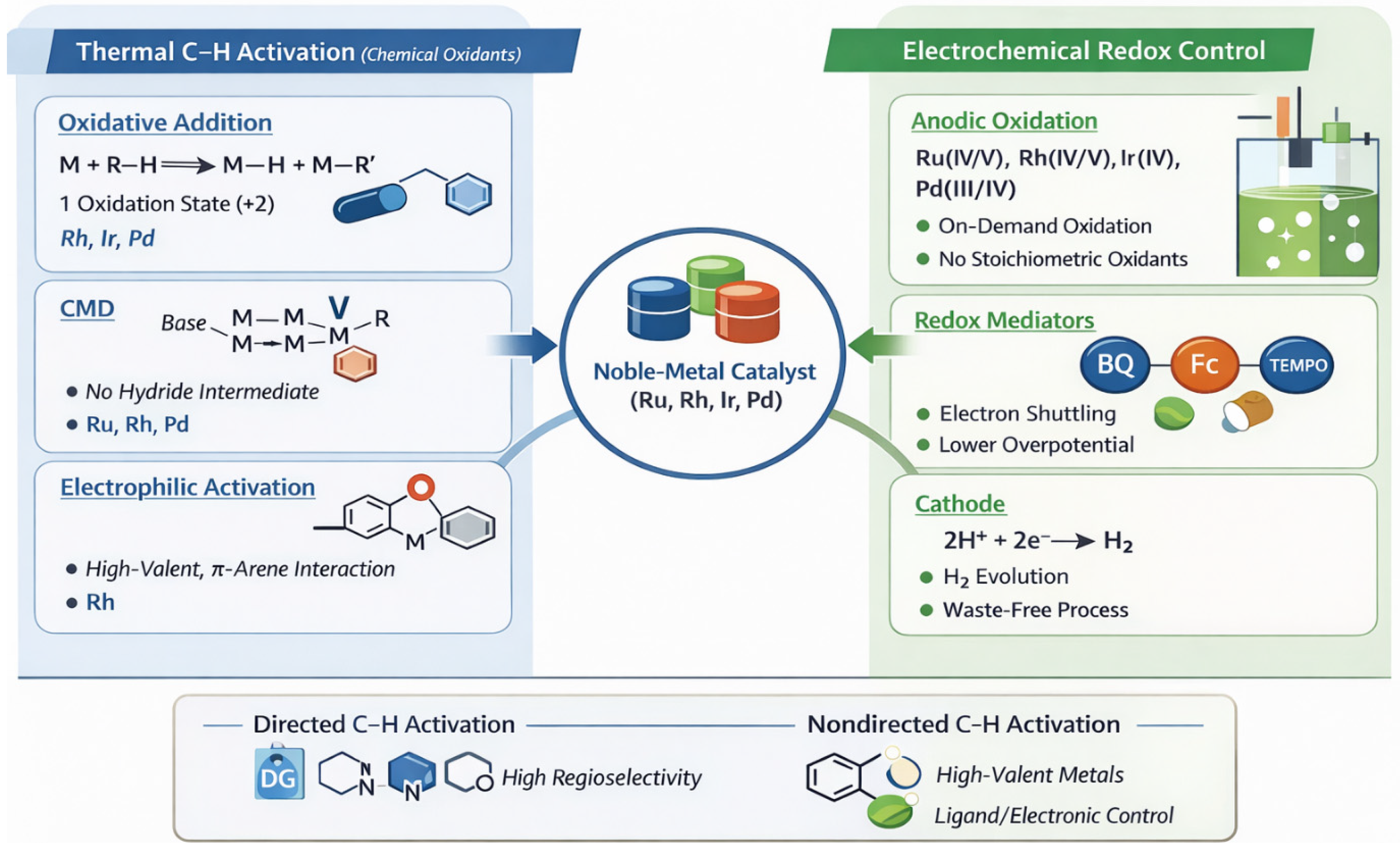 Noble transition metals particularly ruthenium, iridium, and rhodium remain foundational to the development of C–H activation chemistry. Their rich redox flexibility, ability to stabilize high-valent organometallic intermediates, and well-established mechanistic profiles make them exceptionally powerful for oxidative and electrooxidative C–H functionalization. Under electrochemical conditions, these metals benefit from precise anodic control of oxidation state, enabling selective access to high-valent species that are often difficult to generate using conventional oxidants. This redox tunability enhances reactivity and selectivity while eliminating the need for stoichiometric metal-based oxidants, thereby improving sustainability and functional group compatibility. In the context of electrooxidative C–H activation, Ru, Ir, and Rh continue to define benchmark reactivity, engaging in oxidative addition, (CMD), and electrophilic C–H activation pathways that support a broad range of C–C and C–heteroatom bond-forming reactions. The following subsections highlight key advances that illustrate the unique reactivity of each noble metal.