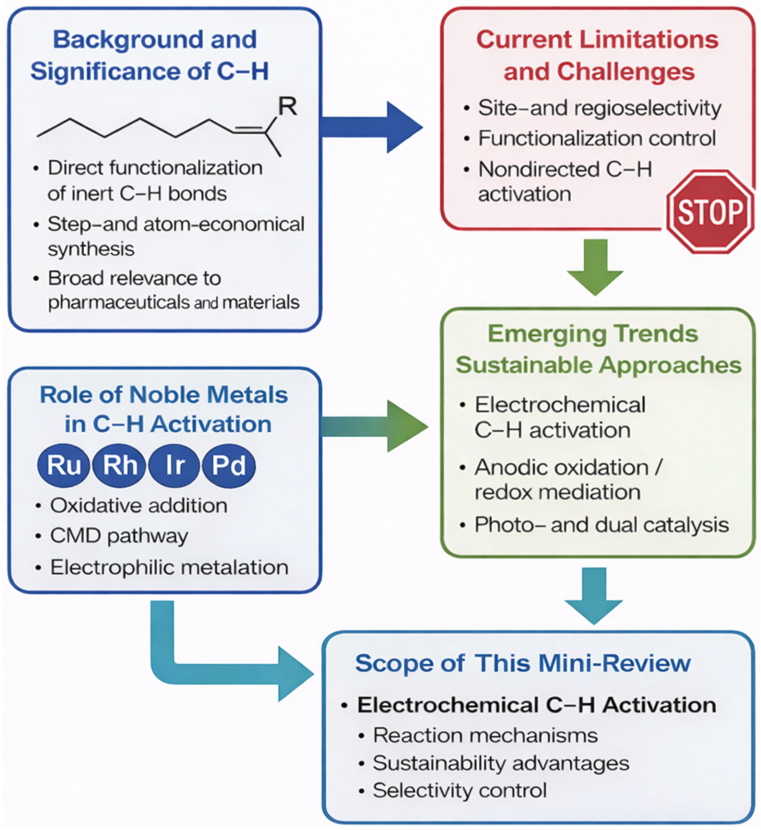 From a broader perspective, electrochemical palladium catalysis has emerged as a powerful and versatile platform for C–H functionalization, enabling access to Pd(II)/Pd(IV) and Pd(0)/Pd(II) redox manifolds under oxidant-free conditions. The ability to precisely control palladium oxidation states electrochemically has unlocked new reactivity patterns, improved selectivity, and mitigated long-standing challenges such as catalyst deactivation and Pd black formation. Despite these advances, remaining challenges include controlling competing redox pathways, expanding nondirected C–H activation, and improving mechanistic resolution. Continued innovation in electrochemical design, ligand development, and reactor engineering is expected to further broaden the scope and sustainability of Pd-mediated C–H activation, positioning palladium as a critical bridge between traditional noble metal catalysis and next-generation electrosynthetic strategies. Despite these promising developments, noble metal electrocatalysis still exhibits notable limitations. For rhodium-based systems, these include a strong dependence on directing groups, limited substrate generality, high catalyst cost, and a relative scarcity of fully mechanistically resolved catalytic cycles. Moreover, many Rh-electrocatalytic protocols remain sensitive to solvent and electrode choice, and scalability has only been demonstrated in select cases. Nevertheless, the growing body of work highlights that rhodium electrocatalysis offers distinctive strengths, particularly for enantioselective C–H activation and access to high-valent Rh redox chemistry. Future progress will likely depend on expanding nondirected reactivity, improving mechanistic understanding of Rh(III)/Rh(I)/Rh(IV)/Rh(V) cycles, and reducing operational barriers to make Rh electrocatalysis more broadly accessible. We can conclude that ruthenium, iridium, rhodium, and palladium now define the current state of the art in non-earth-abundant transition metal electrocatalysis for C–H activation. Each metal contributes distinct reactivity profiles and mechanistic insights, while also revealing persistent limitations that increasingly motivate the shift toward earth-abundant alternatives.