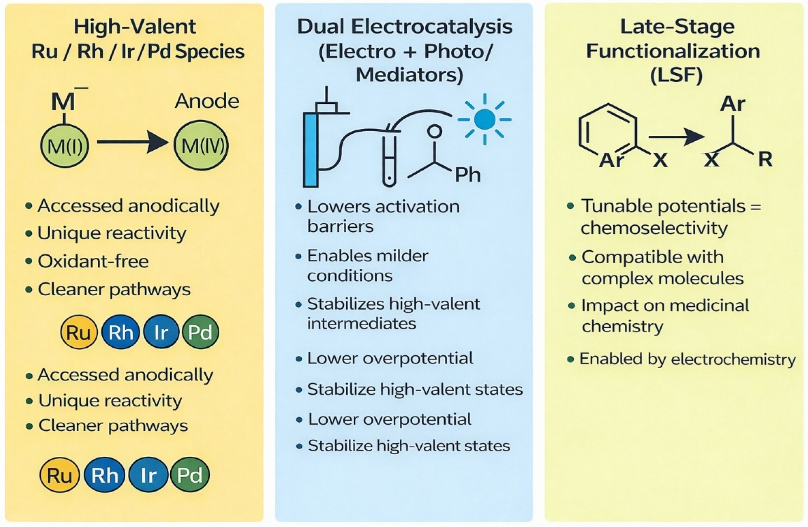 4. This seminal work illustrates both the promise and remaining challenges of Ru electrocatalysis: while ruthenium offers unique selectivity and functional group tolerance under electrochemical conditions, the mechanistic landscape particularly involving high-valent Ru(IV/V) remains relatively underexplored compared to its palladium counterparts.