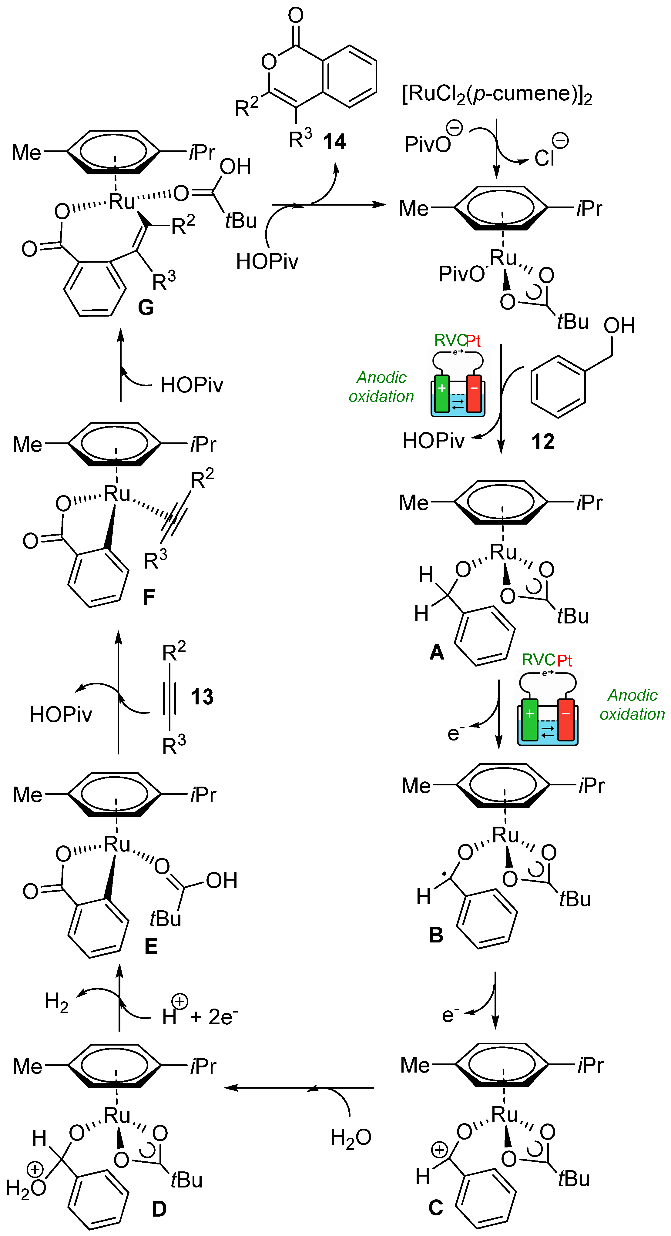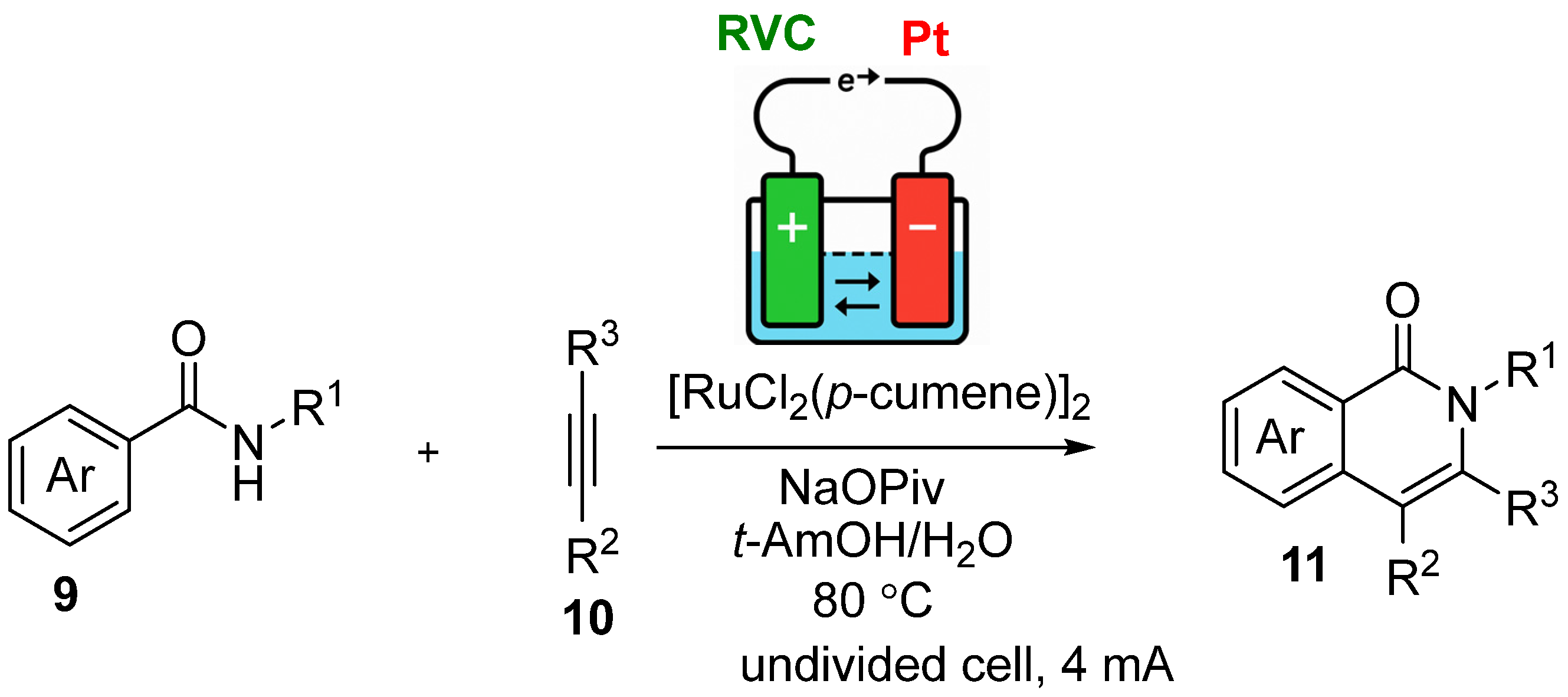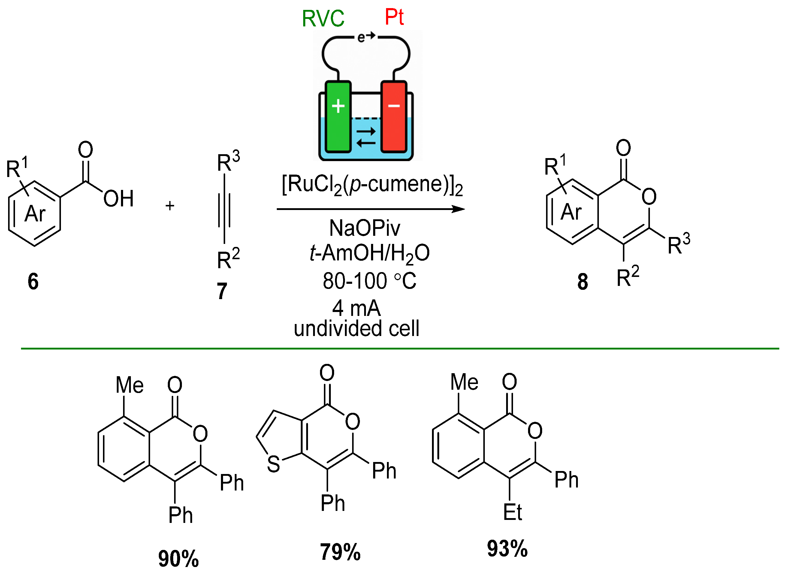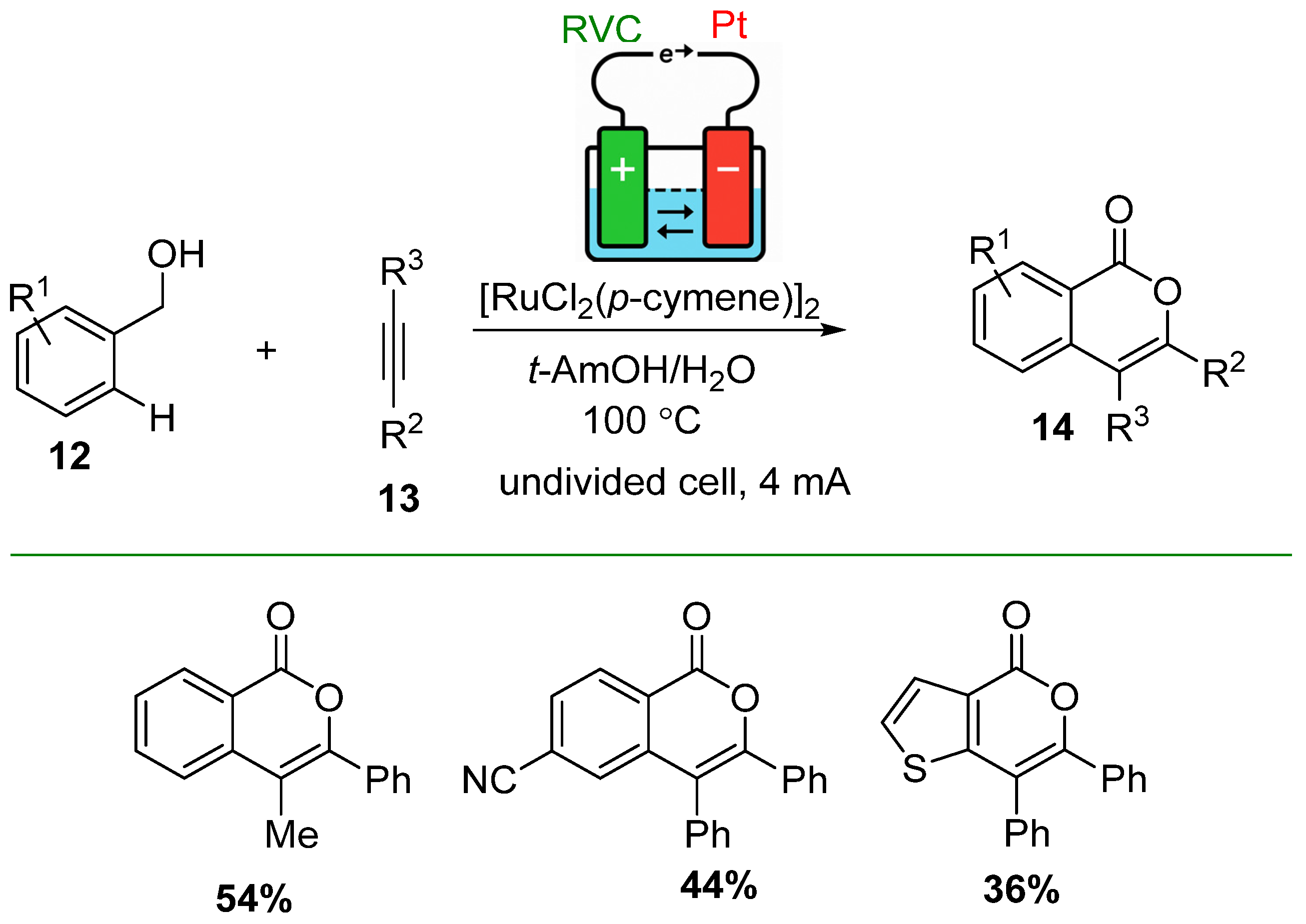 Scheme 5). Their electrooxidative [4 + 2] annulation delivers isocoumarins 14 with excellent site-selectivity. This study is particularly instructive because it shows how electrochemistry can create unique Ru intermediates unlikely to arise in purely chemical oxidations. The reaction was conducted in an undivided cell equipped with a graphite rod anode and a platinum plate cathode under constant-current conditions (4 mA), using