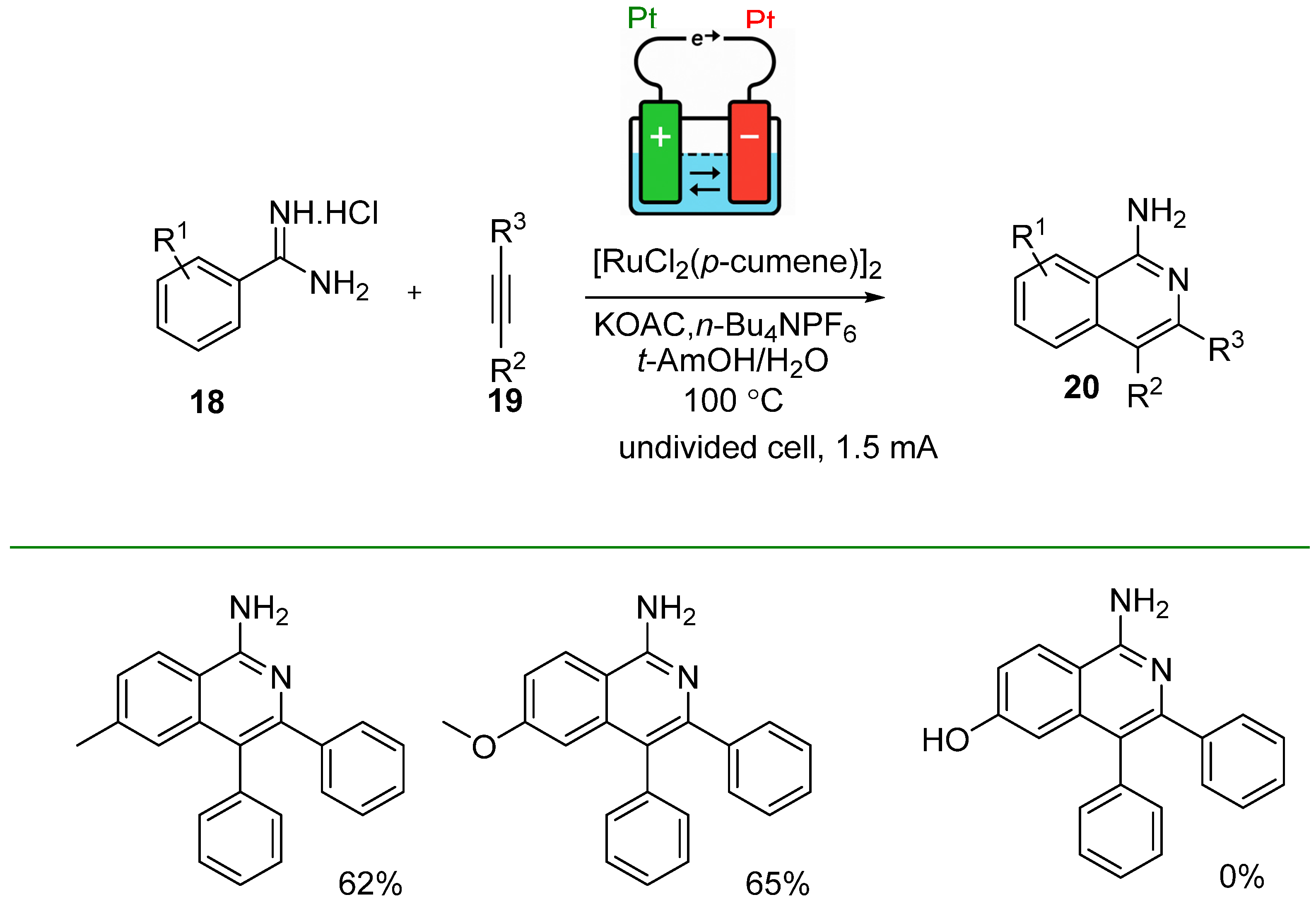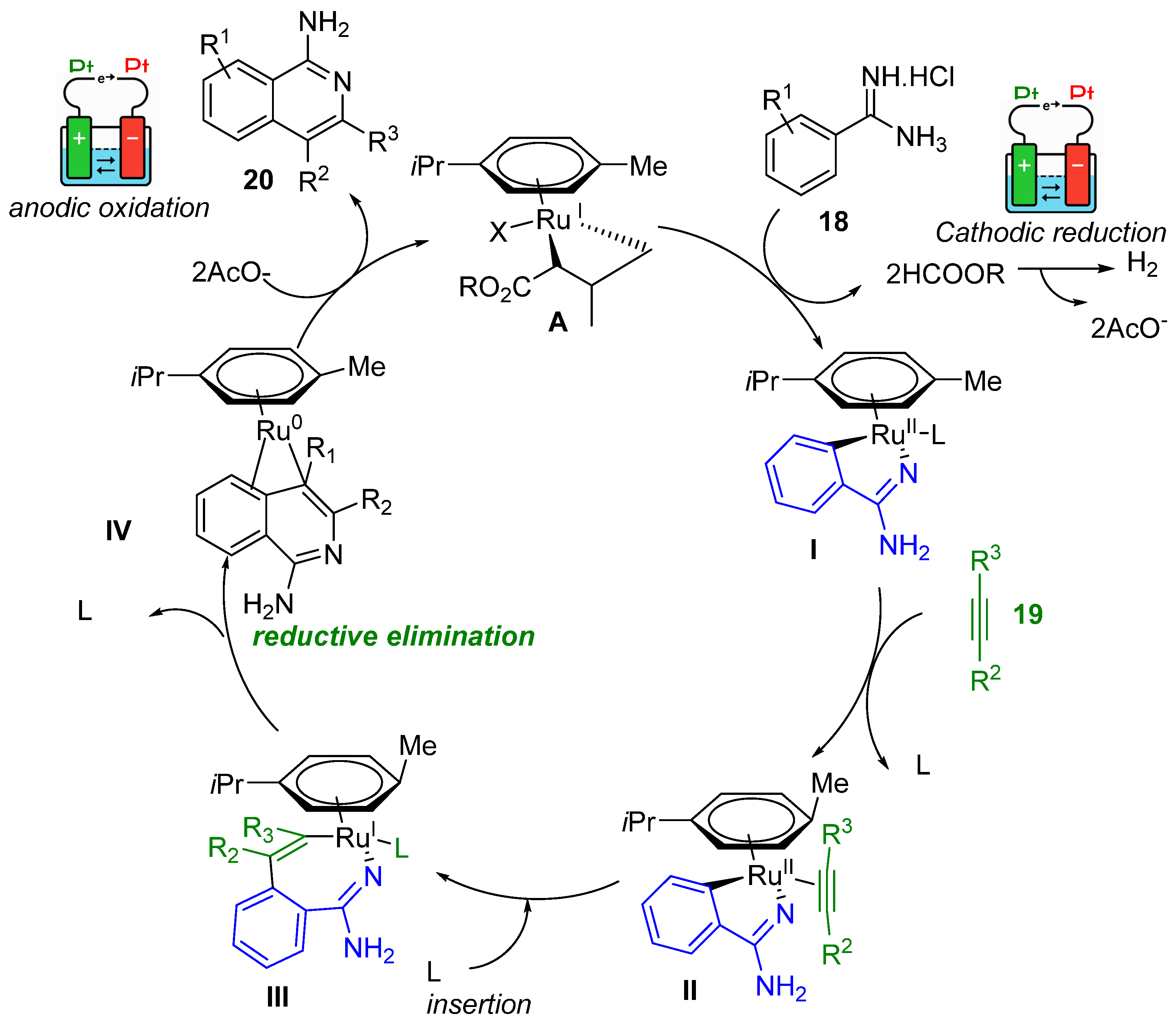 Electrolysis was conducted in an undivided cell equipped with a Pt anode and a Pt cathode under constant-current conditions (1.5 mA) at 100 °C, using n-Bu4NPF6 as the supporting electrolyte and KOAc as the base. The catalyst was dissolved in a t-AmOH/H2O solvent system. The authors find that Benzamidine hydrochlorides bearing para-electron-donating substituents afforded the corresponding products in moderate to satisfactory yields of 65%. In contrast, no product formation was observed when a para-hydroxy-substituted benzamidine hydrochloride was subjected to the optimized conditions. Overall, benzamidines containing electron-withdrawing groups delivered higher yields of 1-aminoisoquinolines, indicating that the reaction is preferentially promoted by electron-withdrawing substituents rather than electron-donating ones. In the presence of KOAc, the dimeric precatalyst undergoes ligand exchange to generate the catalytically active ruthenium diacetate species A. Coordination of this Ru(II) complex with substrate 18 initiates cyclometalation, forming the key five-membered ruthenacycle I through C–H activation. Subsequent alkyne insertion and sequential C–C/C–N bond-forming steps furnish the annulated product. Crucially, anodic oxidation regenerates the active Ru(II) species, thereby sustaining the catalytic cycle without the need for external chemical oxidants, while proton reduction at the cathode simultaneously produces H2 as the only stoichiometric byproduct. This electrochemically driven redox balance underscores the operational sustainability and efficiency of the Ru-catalyzed annulation process.