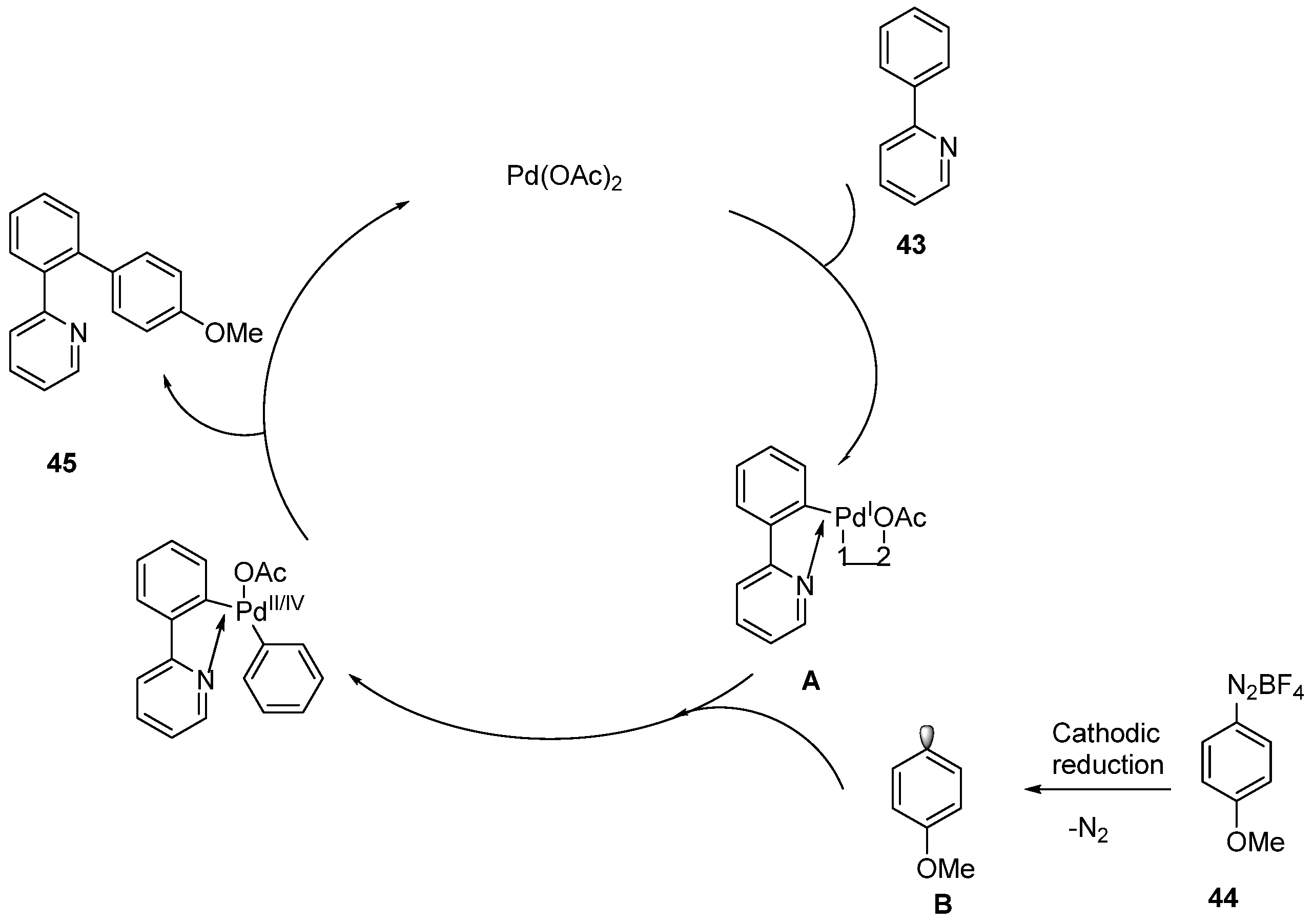 42, along with a reduced Pd(I) or Pd(0) species. The palladium catalyst is then reoxidized anodically to Pd(II) either during aryl radical coordination or after reductive elimination thereby regenerating the active catalyst and sustaining the electrocatalytic cycle.