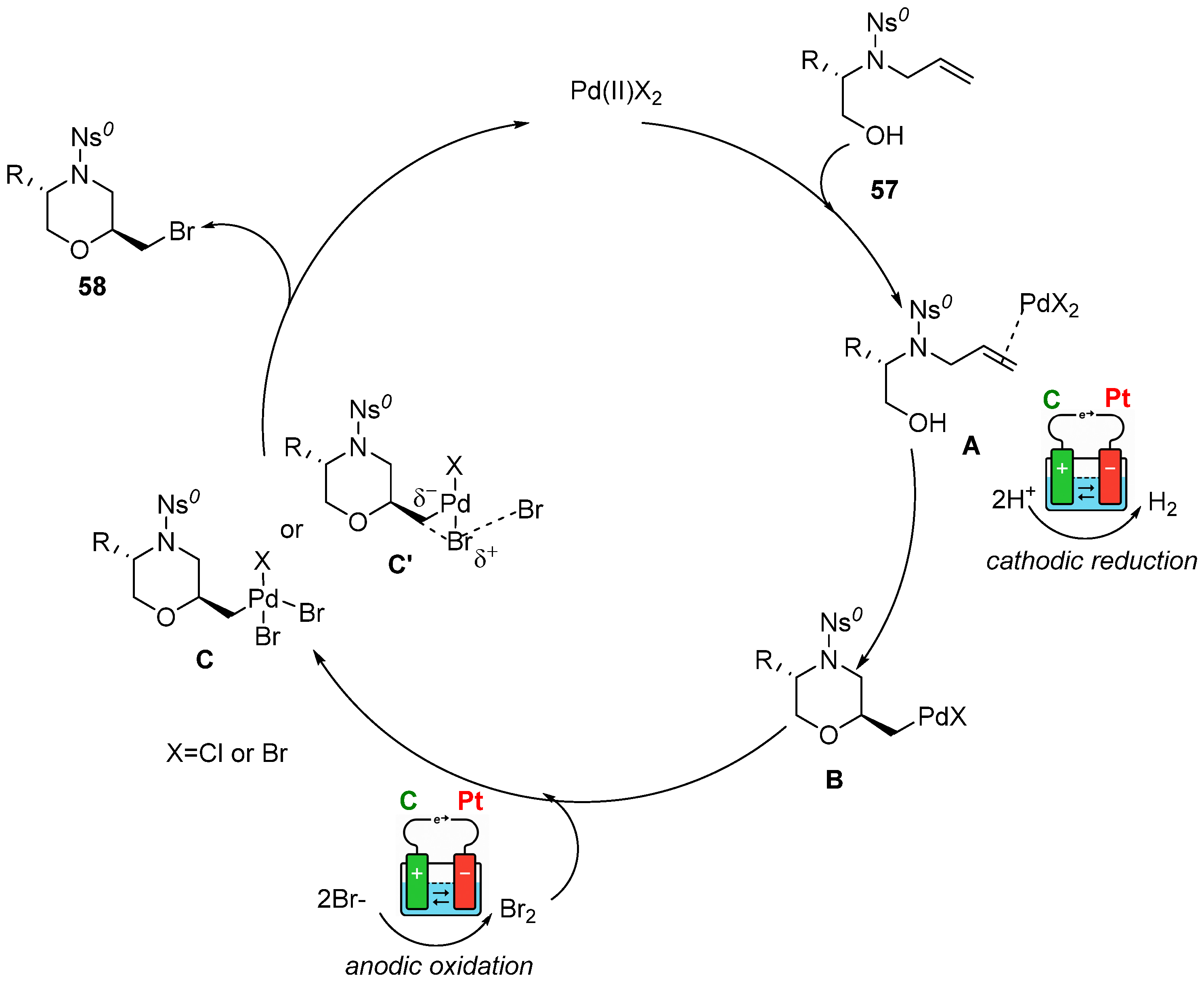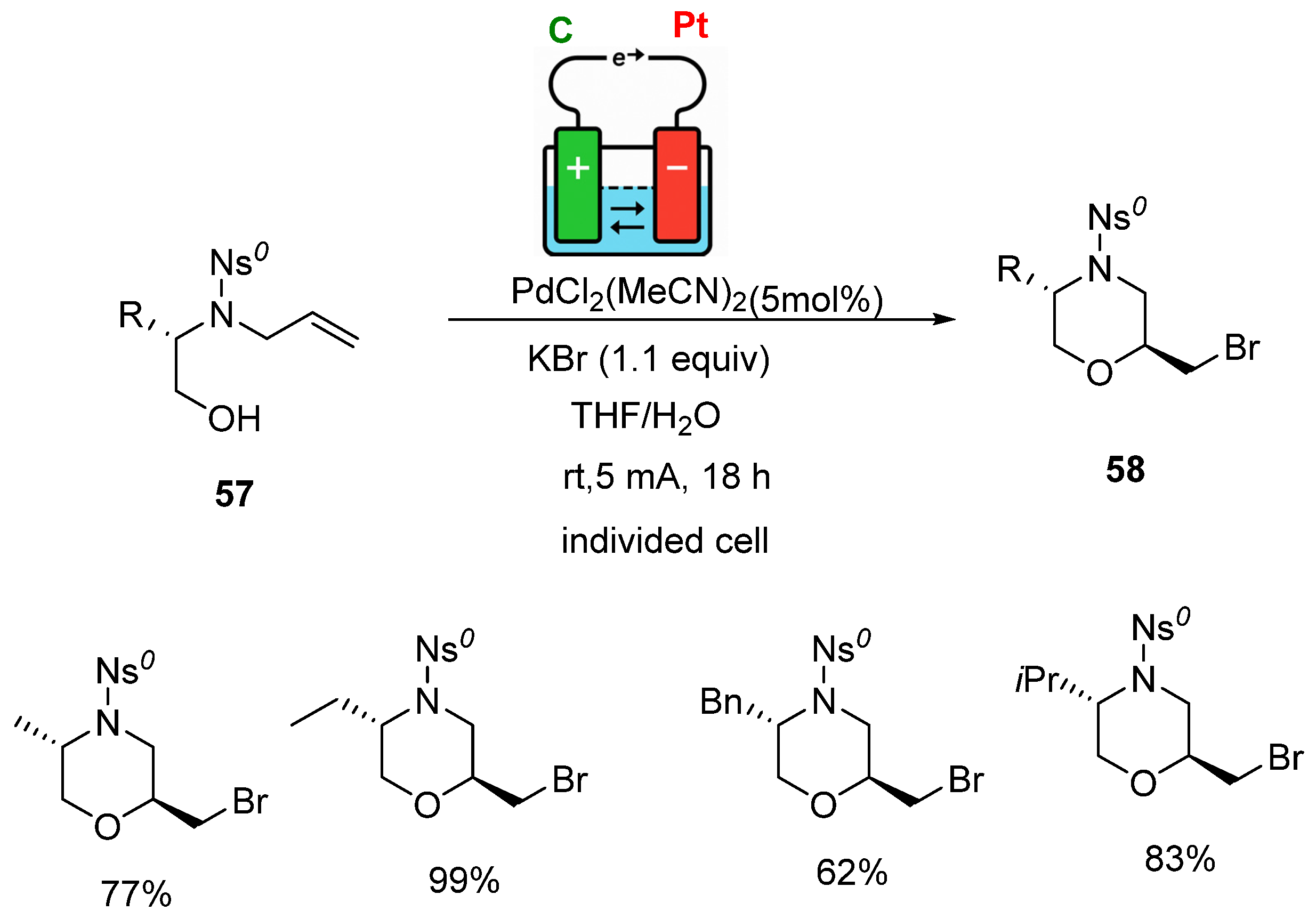 Scheme 31). The approach relies on 2-bromomethyl morpholines as key intermediates, which are formed diastereoselectively via Pd-electrocatalyzed alkoxybromination of unactivated alkenols.