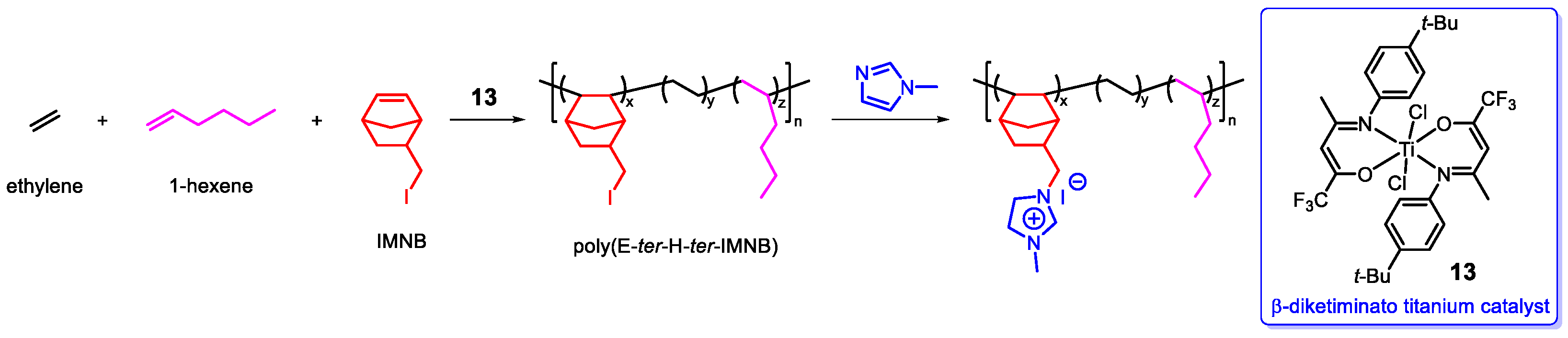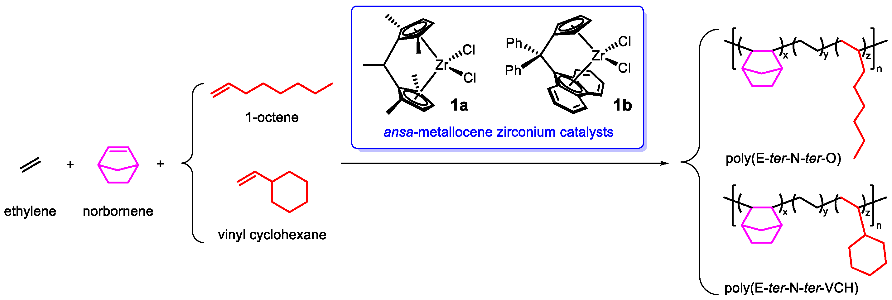 - Boggioni, L.; Harakawa, H.; Losio, S.; Nomura, K.; Tritto, I. Synthesis of ethylene-norbornene-1-octene terpolymers with high 1-octene contents, molar masses, and tunable Tg values, in high yields using half-titanocene catalysts. Polym. Chem. 2021, 12, 4372–4383. [Google Scholar] [CrossRef]