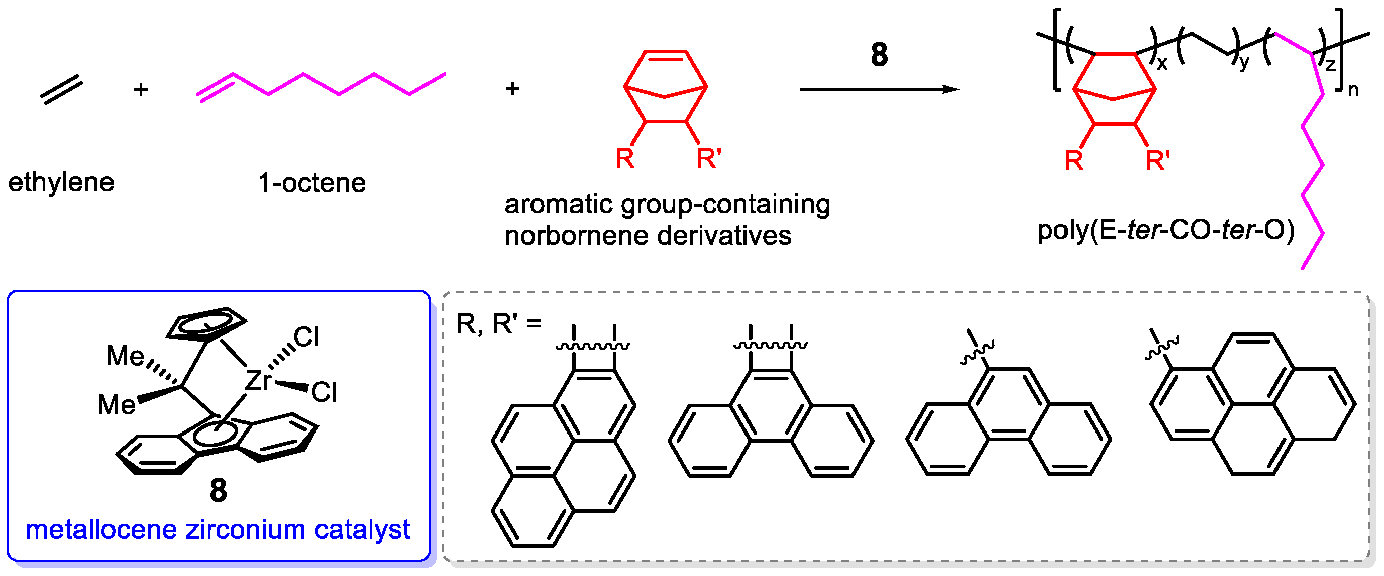 - Wang, W.; Qu, S.; Li, X.; Chen, J.; Guo, Z.; Sun, W.-H. Transition metal complex catalysts promoting copolymers of cycloolefin with propylene/higher olefins. Coord. Chem. Rev. 2023, 494, 215351. [Google Scholar] [CrossRef]