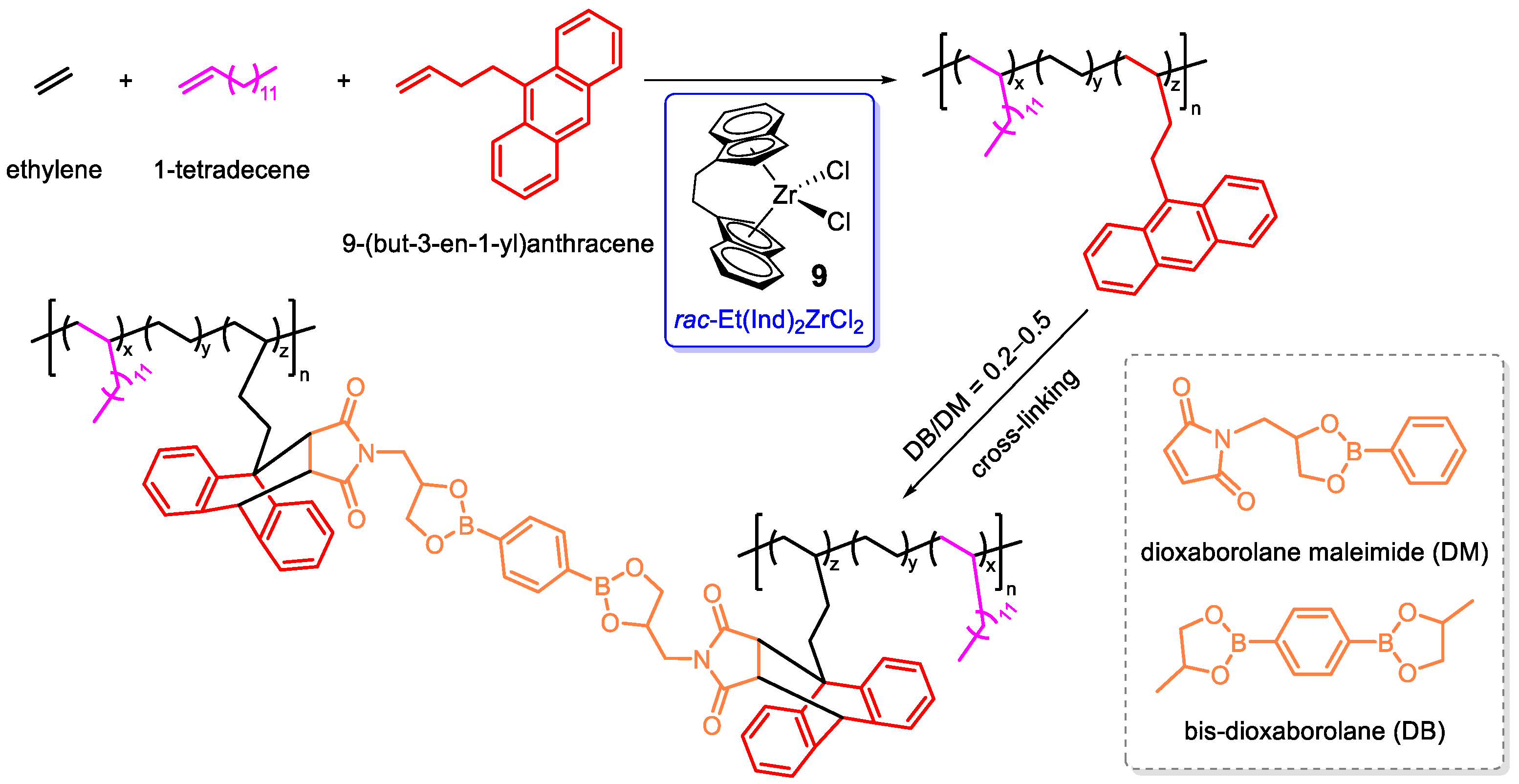 - Huang, L.; Yang, Y.; Shao, J.; Xiong, G.; Wang, H.; Nishiura, M.; Hou, Z. Synthesis of Tough and Fluorescent Self-Healing Elastomers by Scandium-Catalyzed Terpolymerization of Pyrenylethenylstyrene, Ethylene, and Anisylpropylene. J. Am. Chem. Soc. 2024, 146, 2718–2727. [Google Scholar] [CrossRef]