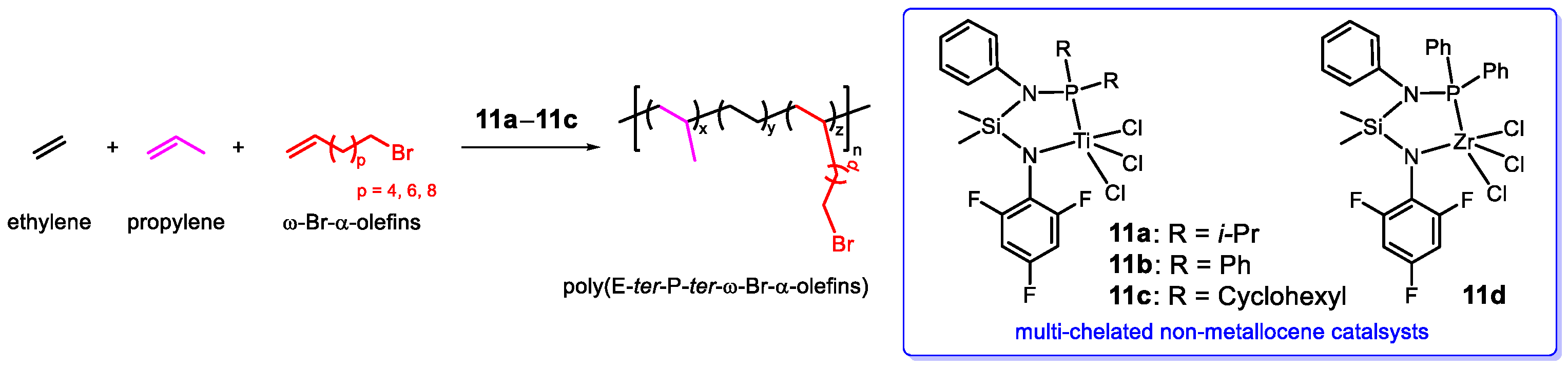 - Wang, J.; He, L.; Nan, F.; Wang, F.; Li, H.; Wang, J.; Liu, D.; Lei, M.; Li, L.; Huang, Q.; et al. Investigation on terpolymer of ethylene/propylene/ω-bromo-α-olefins catalyzed by titanium complexes. J. Mater. Sci. 2017, 52, 5981–5991. [Google Scholar] [CrossRef]