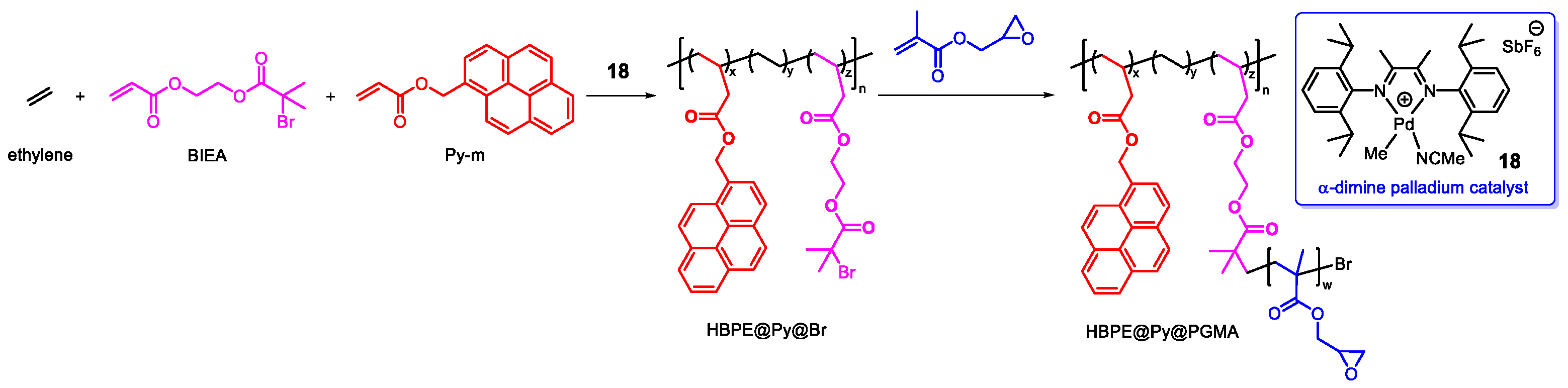 - Song, J.; He, J.; Hu, J.; Ma, J.; Jiang, H.; Hu, S.; Ye, H.; Xu, L. A Universal Strategy for Producing Fluorescent Polymers Based on Designer Hyperbranched Polyethylene Ternary Copolymers. Macromolecules 2022, 55, 2085–2095. [Google Scholar] [CrossRef]