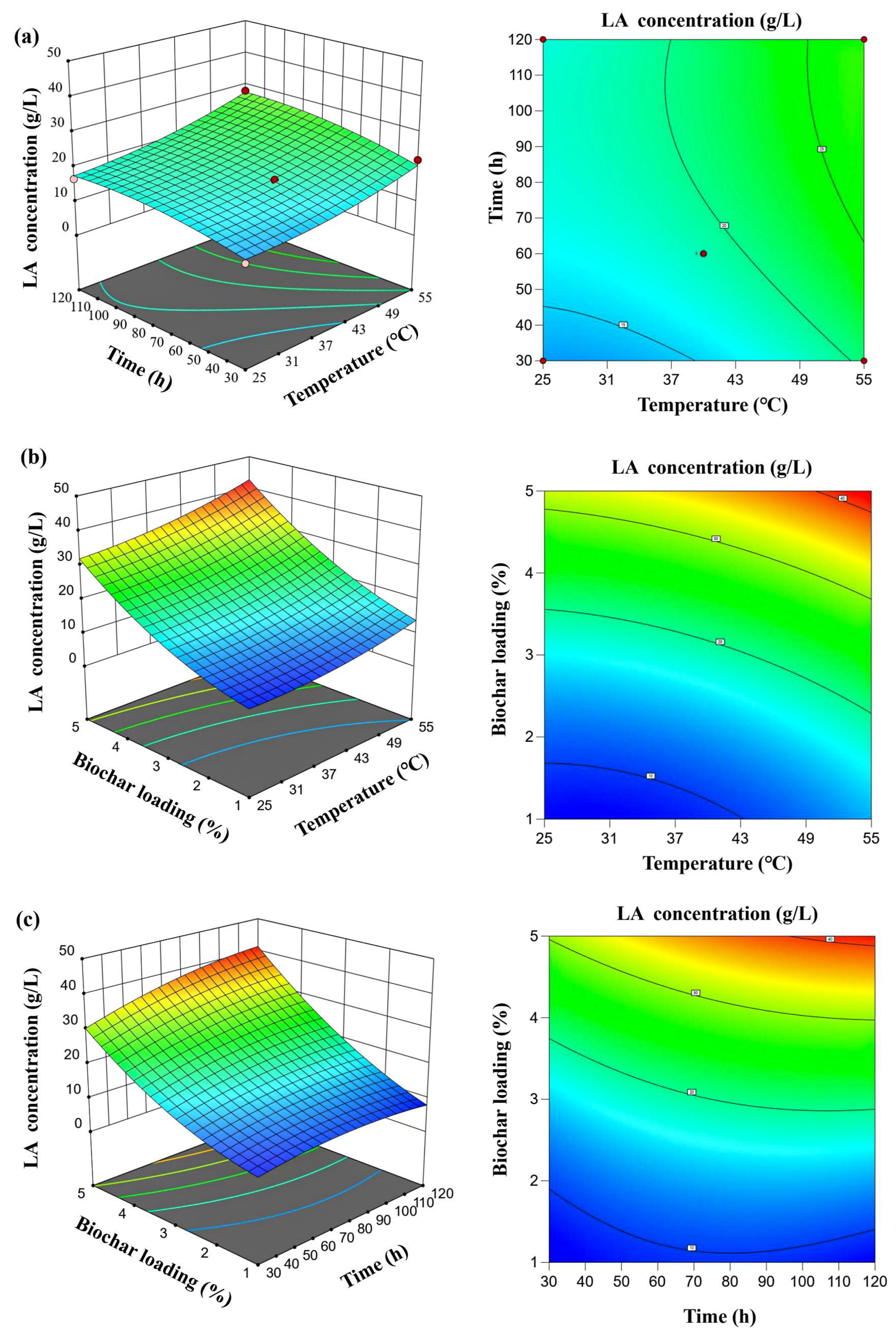 | Run | Temperature (°C) | Detoxification Time (min) | Biochar Loading (% w/v) | 72 h LA Concentration (g/L) | Predicted LA Concentration (g/L) |