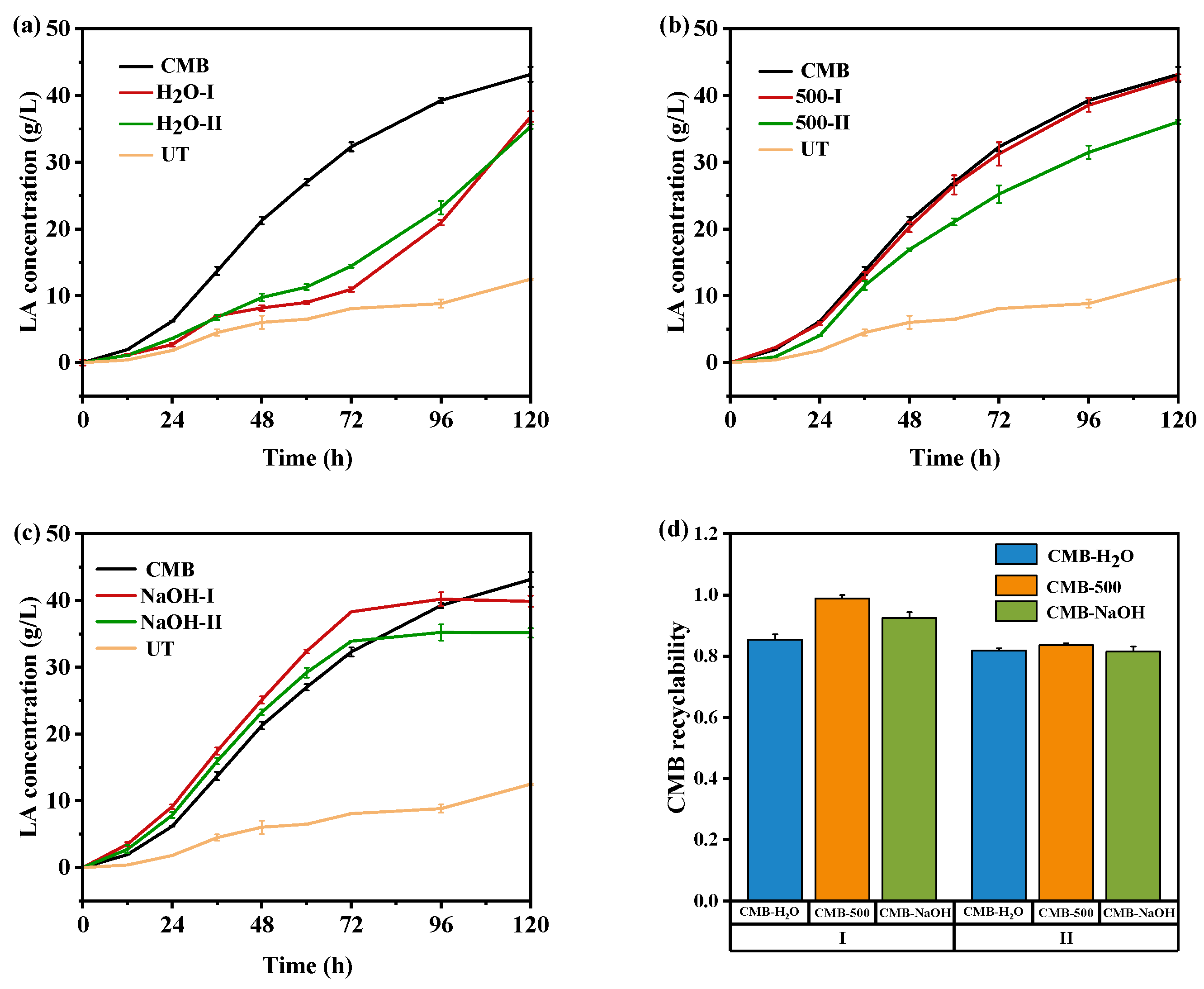 - Shen, Y.; Luo, L.; Chong, K.; Yang, Y.; Blersch, D.; Balasundram, V.; Shi, S.; Han, L. The targeted removal of aromatic inhibitors in dilute acid prehydrolysate of corn stover by KOH-modified biochar for the efficient production of lactic acid. J. Environ. Manag. 2025, 395, 127902. [Google Scholar] [CrossRef]