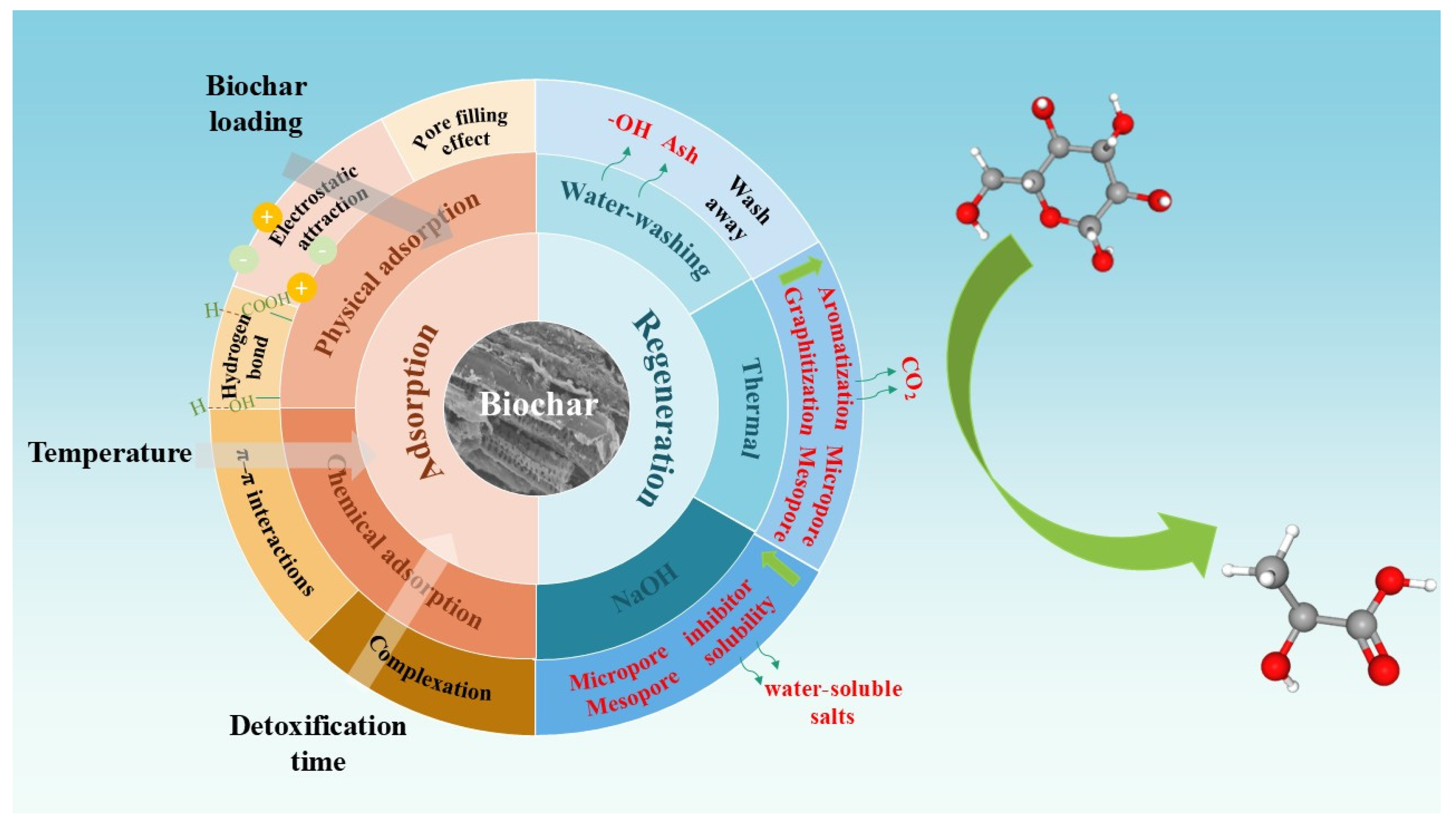| Cow manure biochar | Cow manure was pyrolyzed at 500 °C for 1 h under a nitrogen atmosphere at a heating rate of 10 °C/min | Water-washing, thermal, NaOH solvent regeneration | 2 cycles | The recyclability for inhibitor removal after second cycles are 81.86%, 81.50%, and 83.51%, respectively | this study |