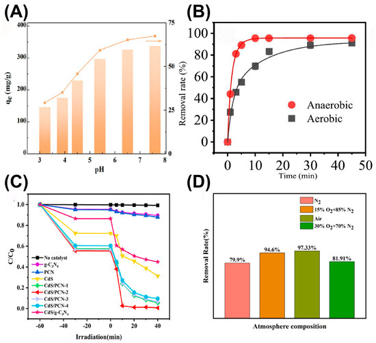 The efficiency, selectivity and catalytic stability of g-C3N4-based photocatalysts in extracting uranium from uranium-containing wastewater and seawater are jointly affected by multiple factors, including the surface chemistry, physical structure, solution chemistry and light conditions. In general, unique surface properties, such as functional groups, specific morphologies and a porous structure, directly affect the behaviors of U(VI) extraction with g-C3N4-based photocatalysts. The introduced functional groups, like the cyano, carboxyl and phosphate groups, usually serve as coordination sites for U(VI) species, and also regulate the electric energy level for efficient separation of charge carriers, consequently enhancing the complexation ability and photoreduction activity. By creating superior apparent morphology and adequate surface pores, g-C3N4-based materials endow the specific surface area with the sufficient exposure of active sites and rapid mass transfer in the reaction system. Additionally, the initial solution pH is also vital, which decides the form of U(VI) species that exists in the solution. Commonly, U(VI) mainly exists as the UO22+ species at a pH in the range of 4-10, which is easiest to capture. As confirmed by Zhang et al., an innovative single-pot method was developed to prepare a bifunctional nanohybrid material, which incorporated nano-scale zero-valent iron (NZVI) between the layers of g-C3N4 to isolate U(VI) from wastewater [30]. The introduction of g-C3N4 as the matrix effectively suppressed the oxidation of NZVI and enhanced the photocatalytic reactivity. As shown in Figure 3A, the higher pH value was conducive to the adsorption of positively charged U(VI). However, in strong acid or alkali conditions, uranyl ions were easily complexed with carbonate and hydroxide ions, with the affinity being reduced. Meanwhile, the environmental atmosphere also has a critical impact on U(VI) photoextraction. For example, Liang et al. synthesized a g-C3N4-supported nZVI (g-Fe) composite and found that the uranium species adsorbed onto the g-Fe composite was only U(VI) under aerobic conditions, while both U(VI) and U(IV) were adsorbed under anaerobic conditions [31]. Therefore, in an aerobic environment, adsorption rather than reduction was the main reaction route for removing U(VI) from water bodies (Figure 3B). In addition, Fu et al. designed a layered hollow core–shell-structured Bi2O3/g-C3N4 Z-scheme heterojunction photocatalyst and successfully applied it to photocatalytic uranium extraction under aerobic and anaerobic conditions, achieving extraction efficiencies of 98.4% and 99.0%, respectively [32]. Zhang et al. prepared a novel composite of CdS and nitrogen-deficient g-C3N4 (CdS/PCN) for the photocatalytic reduction of uranyl under aerobic conditions [33]. It was observed that CdS/PCN not only displayed a high photoreduction activity towards uranyl under aerobic conditions, but also the photo-corrosion of CdS by oxygen and h+ was effectively inhibited. Interestingly, the removal efficiency under air conditions was superior to that in a N2 or O2 (30%) atmosphere, indicating that an appropriate amount of oxygen accelerated the reduction reaction, while excessive oxygen weakened the reduction behavior (Figure 3C,D). Meanwhile, excessive dissolved O2 re-oxidized U(IV) to U(VI).
