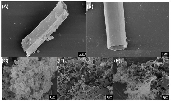 (A) The SEM images of HCN and (B) HCNCR. Reprinted with permission from ref. [46]. (C) SEM images of CN, (D) MCN45, and (E) MCN90 photocatalysts. Reprinted with permission from ref. [51].