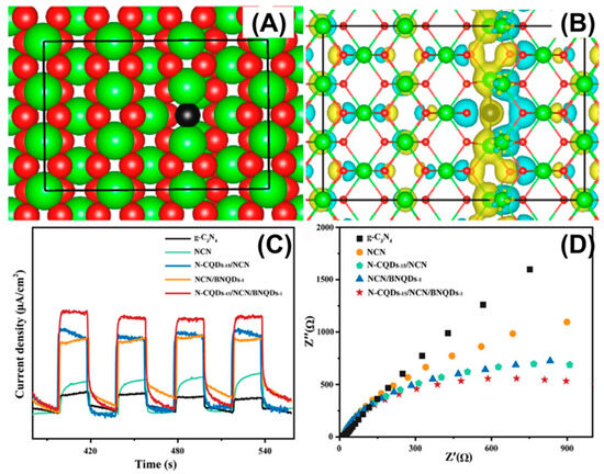 (A) Simulated structure of CeO2−X (Ce and O atoms are shown in green and red, respectively, whereas the O atom near an oxygen vacancy is highlighted in black), and (B) charge energy difference of CeO2−x. Reprinted with permission from ref. [20]. (C) Transient photocurrent response and (D) EIS Nyquist plots. Reprinted with permission from ref. [107].