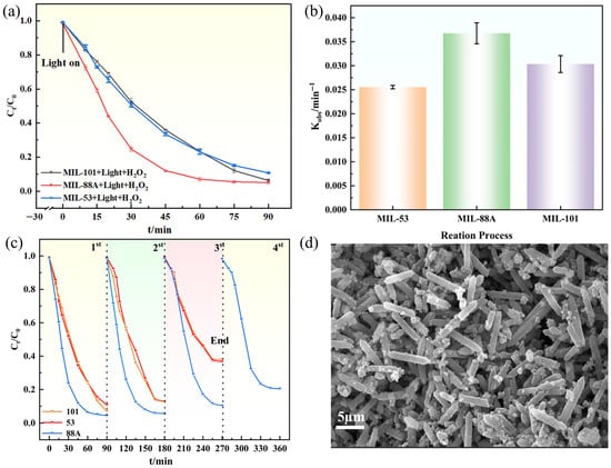 (a) Degradation curves of the MIL series; (b) Degradation rate constants; (c) Cycling stability; (d) SEM of MIL-88A(Fe) after cycling.