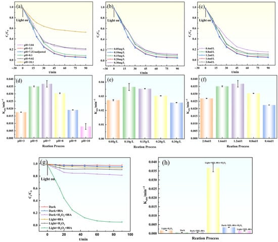 (a–c,g) Effects of different conditions on GAT degradation; (d–f,h) degradation rate constants (Kobs) of GAT under different conditions.