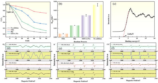 (a) Effect of radical scavengers on GAT degradation; (b) Relationship between degradation rate constant (Kobs) and radical scavengers; (c) VB-XPS spectrum of MIL-88A(Fe); ESR spectra of (d) DMPO–•O2−, (e) TEMPO–h+, and (f) DMPO–•OH detected in different systems.