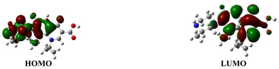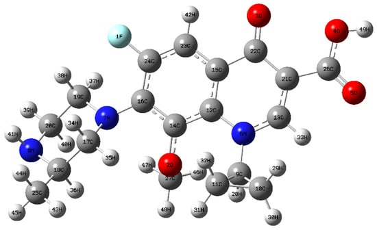 To identify the vulnerable sites of the GAT molecule, density functional theory (DFT) calculations based on Fukui function theory were performed. Geometry optimization and frequency calculations were carried out in the gas phase using Gaussian 09W at the B3LYP/6-311+G(d,p) level. Solvent effects were not explicitly included. The calculated Fukui indices and frontier molecular orbitals were used to qualitatively identify the most reactive sites of GAT rather than to provide quantitative energetic predictions. The nucleophilic Fukui index (f−) was computed to locate sites susceptible to electrophilic attack (e.g., •OH, h+). In addition, the spatial distributions of the highest occupied molecular orbital (HOMO) and lowest unoccupied molecular orbital (LUMO) were analyzed (Figure 8 and Figure 9). The HOMO regions are more likely to undergo electron loss (attacked by h+ or electrophilic radicals), whereas the LUMO regions are more likely to undergo electron gain (attacked by nucleophilic species). Furthermore, natural bond orbital (NBO) analysis was performed to investigate the atomic charge distribution. The results indicate that the 7N and 8N atoms on the piperazine ring exhibit both higher nucleophilic Fukui indices (f−) and higher HOMO density distributions (Figure 9), suggesting they are the most susceptible to electrophilic reactive species (•OH, h+). The 3O atom on the quinolone ring also shows relatively high reactivity.