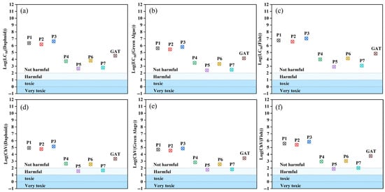 The ecological toxicity assessment of degradation products is crucial for evaluating the environmental safety of water treatment technologies [38]. The ECOSAR (Ecological Structure–Activity Relationship) software v2.2 (U.S. Environmental Protection Agency, Washington, DC, USA) was employed to predict the acute and chronic toxicity of the parent compound GAT and its major degradation intermediates (P1–P7) toward three aquatic organisms (fish, Daphnia, and green algae), based on its classification rules. Acute toxicity was expressed as the median lethal concentration or median effective concentration (LC/EC50), while chronic toxicity was expressed as the chronic value (ChV50). The prediction results are shown in Figure 11.