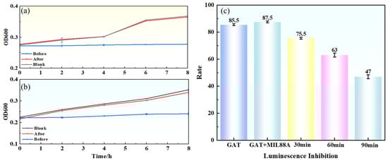 Antibacterial activity and acute toxicity before and after degradation: (a) mixed bacteria, (b) E. coli, (c) luminescent bacteria inhibition rates.