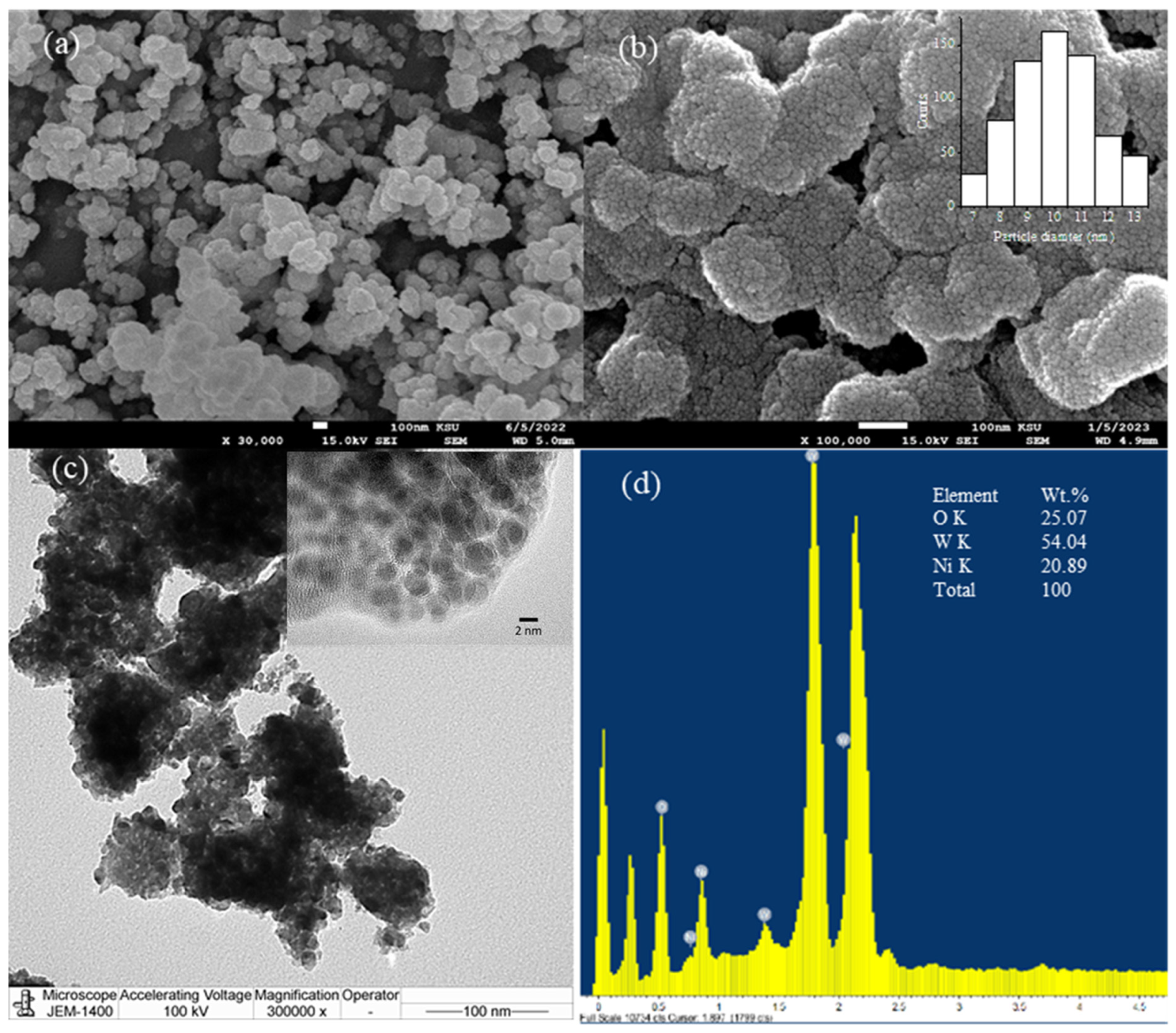 3.3. Nickel Tungstate (NiWO4) Catalyst Characterizations