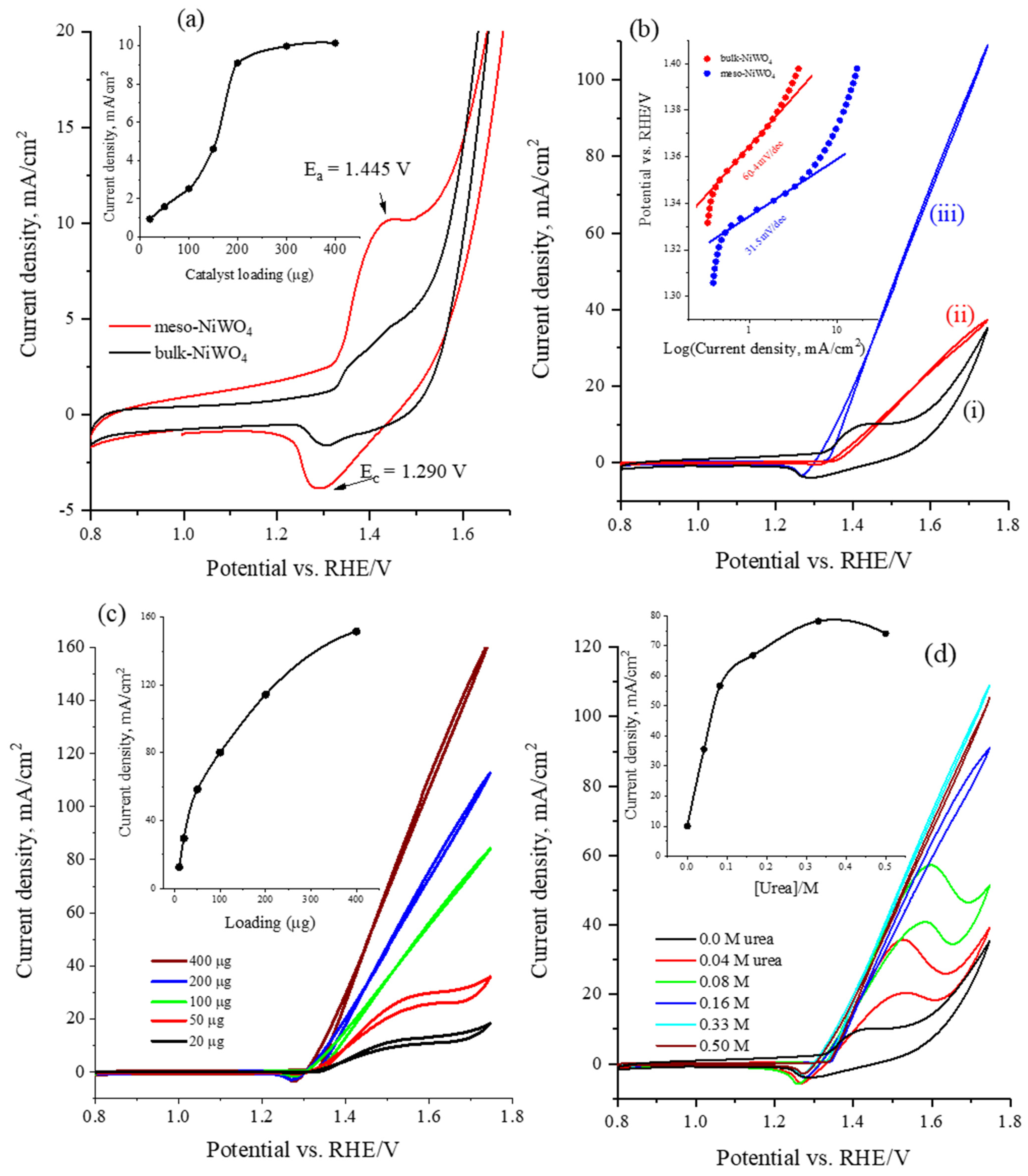 - Wang, L.; Zhu, S.; Wang, Y.; Liu, Z.; Liu, Y.; Wang, Q.; Gu, M.; Li, K.; Sun, X.; Yang, L.; et al. Amorphous nickel tungstate nanocatalyst boosts urea electrooxidation. Chem. Eng. J. 2023, 460, 141826. [Google Scholar] [CrossRef]