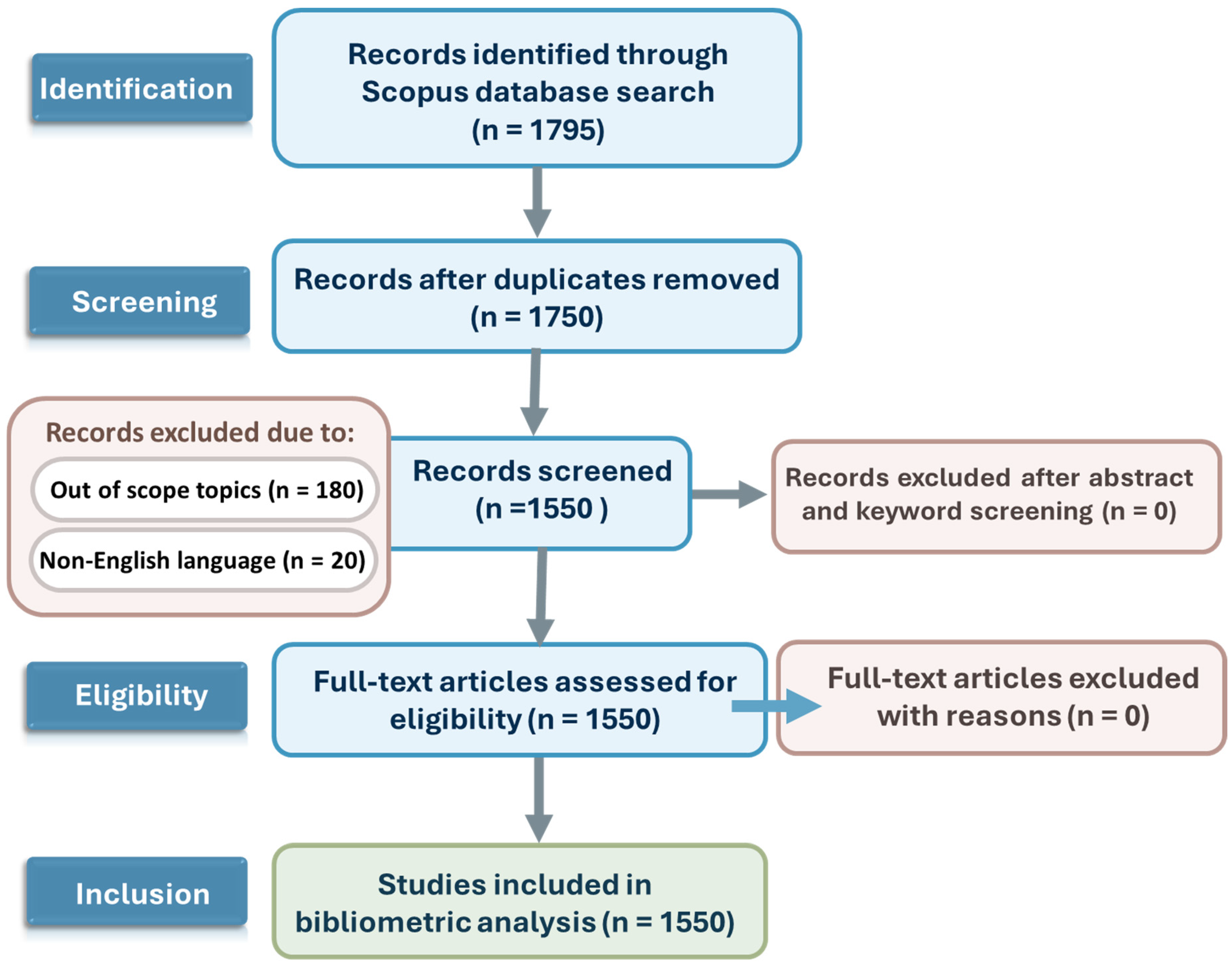 The eligibility assessment involved a full-text evaluation of the remaining 1550 articles. At this stage, studies were examined to confirm their explicit focus on catalytic, photocatalytic, or advanced oxidation processes applied to water or wastewater treatment. Attention was given to the availability and completeness of bibliometric metadata, including authorship, affiliations, keywords, citations, and publication type. Articles with incomplete metadata, missing bibliometric information, or a tangential focus such as studies primarily addressing catalytic hydrogen production or unrelated chemical processes were considered for exclusion. However, no records met the exclusion criteria at this stage, and all 1550 full-text articles were deemed eligible for inclusion. It should be noted that this bibliometric approach is subject to certain limitations, including potential database bias inherent to Scopus, the exclusion of non-English publications, and the reliance on the accuracy and completeness of the bibliometric metadata. These factors may have resulted in the underrepresentation of some regional research outputs or studies published in languages other than English. Specifically, studies addressing the removal of pollutants including organic compounds, dyes, pharmaceuticals, and heavy metals were included, ensuring that the review captured key targets of catalytic water and wastewater treatment research.