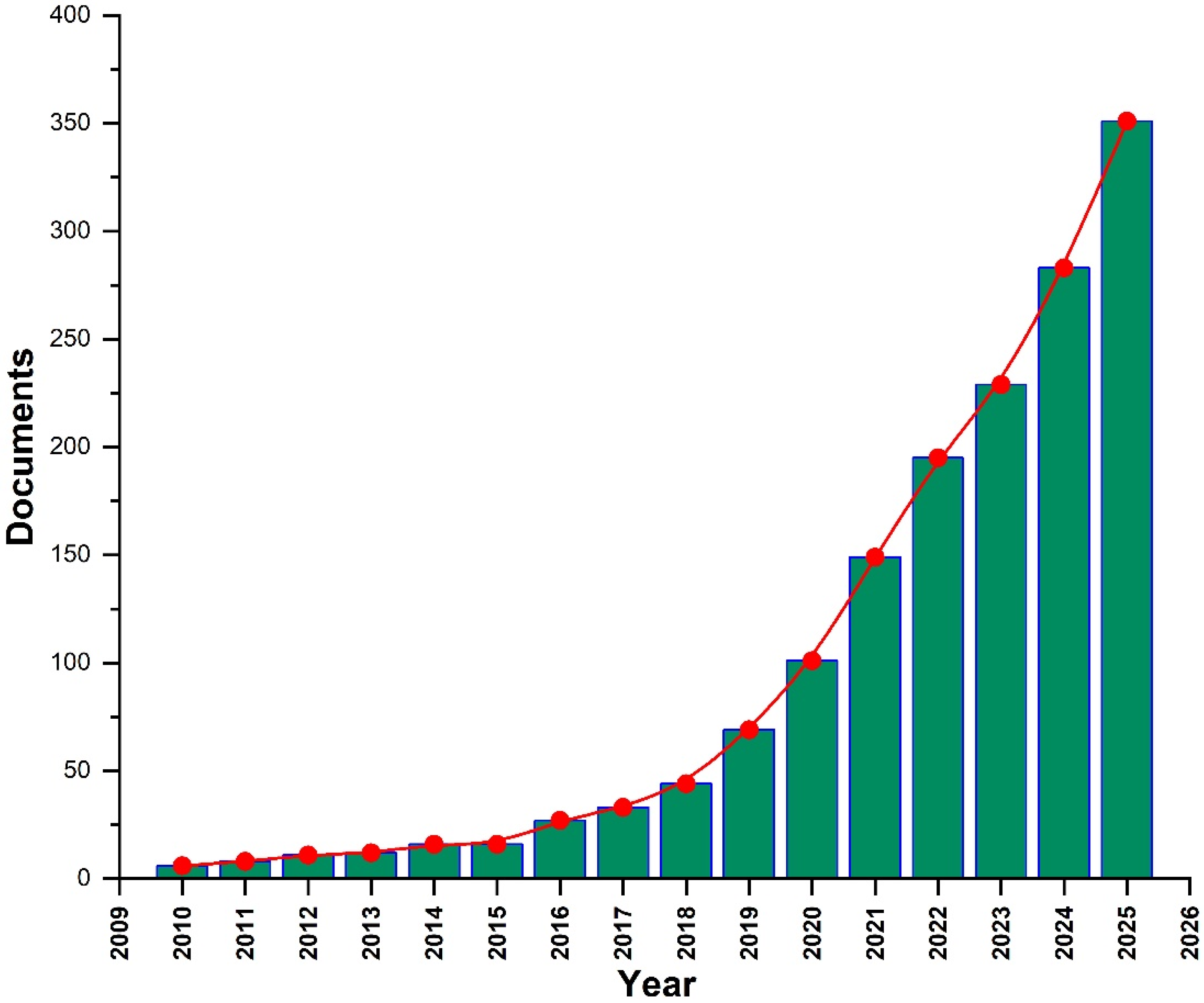 The post-2020 period exhibits near-exponential growth, with publications increasing from 149 in 2021 to a peak of 351 in 2025, as shown in
