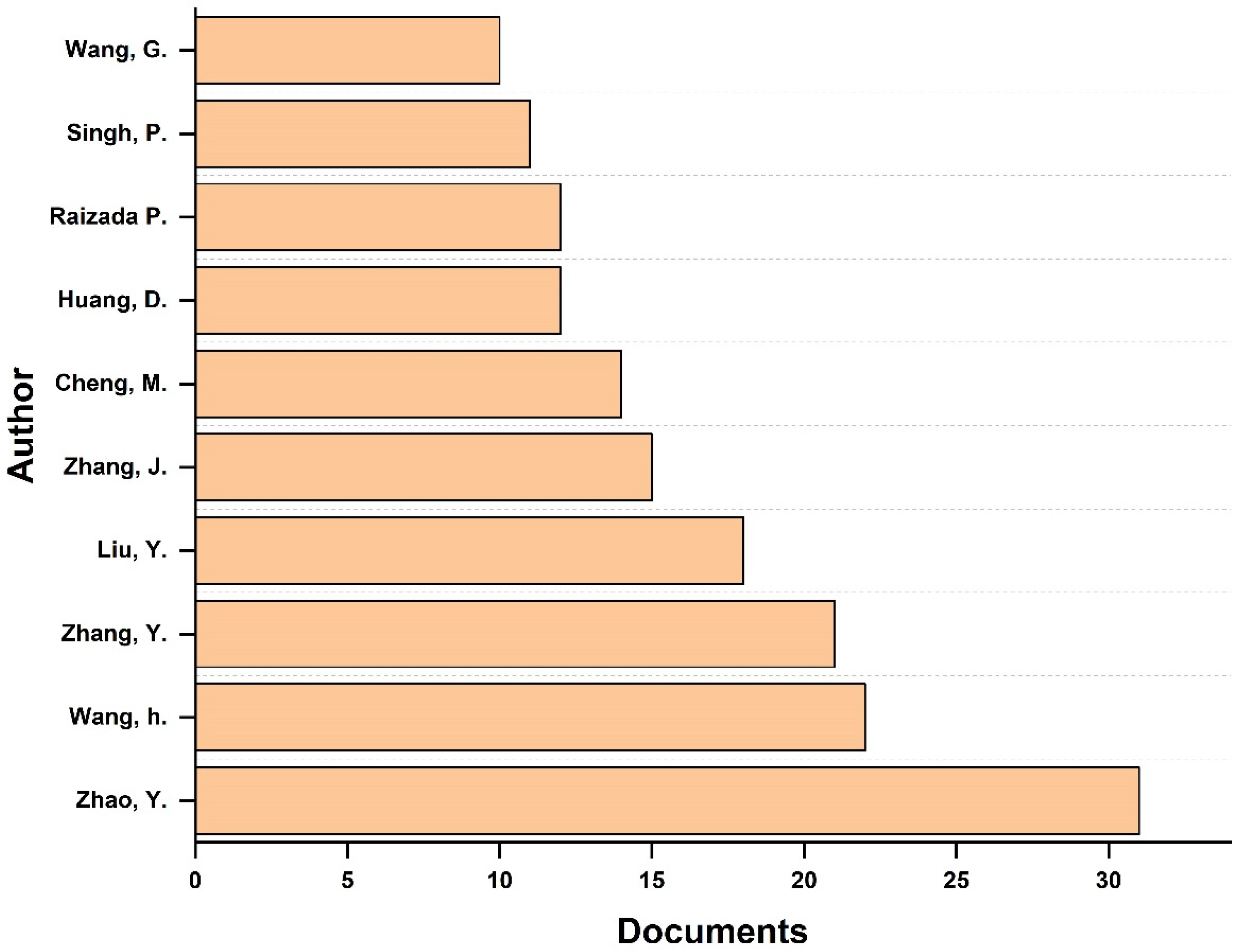 The analysis of the most productive authors highlights a highly skewed authorship structure, consistent with Lotka’s law, where a small cohort of researchers contributes a disproportionate share of publications in catalytic degradation for water and wastewater treatment. As shown in the top-author distribution, Zhao, Y. (31 documents) and Wang, H. (28 documents) emerge as the most prolific contributors, followed by Zhang Y., X. (21 documents) and Liu, Y. (18 documents). The dominance of these authors reflects sustained research engagement rather than sporadic contributions, indicating the presence of established research programs centred on catalyst synthesis, advanced oxidation processes, and mechanistic degradation pathways. The recurrence of common surnames such as Wang and Zhang distinguished by initials also suggests strong representation from large research ecosystems, particularly in East Asia, where institutional capacity and funding for environmental catalysis are well developed. Collectively, the top ten authors as shown in