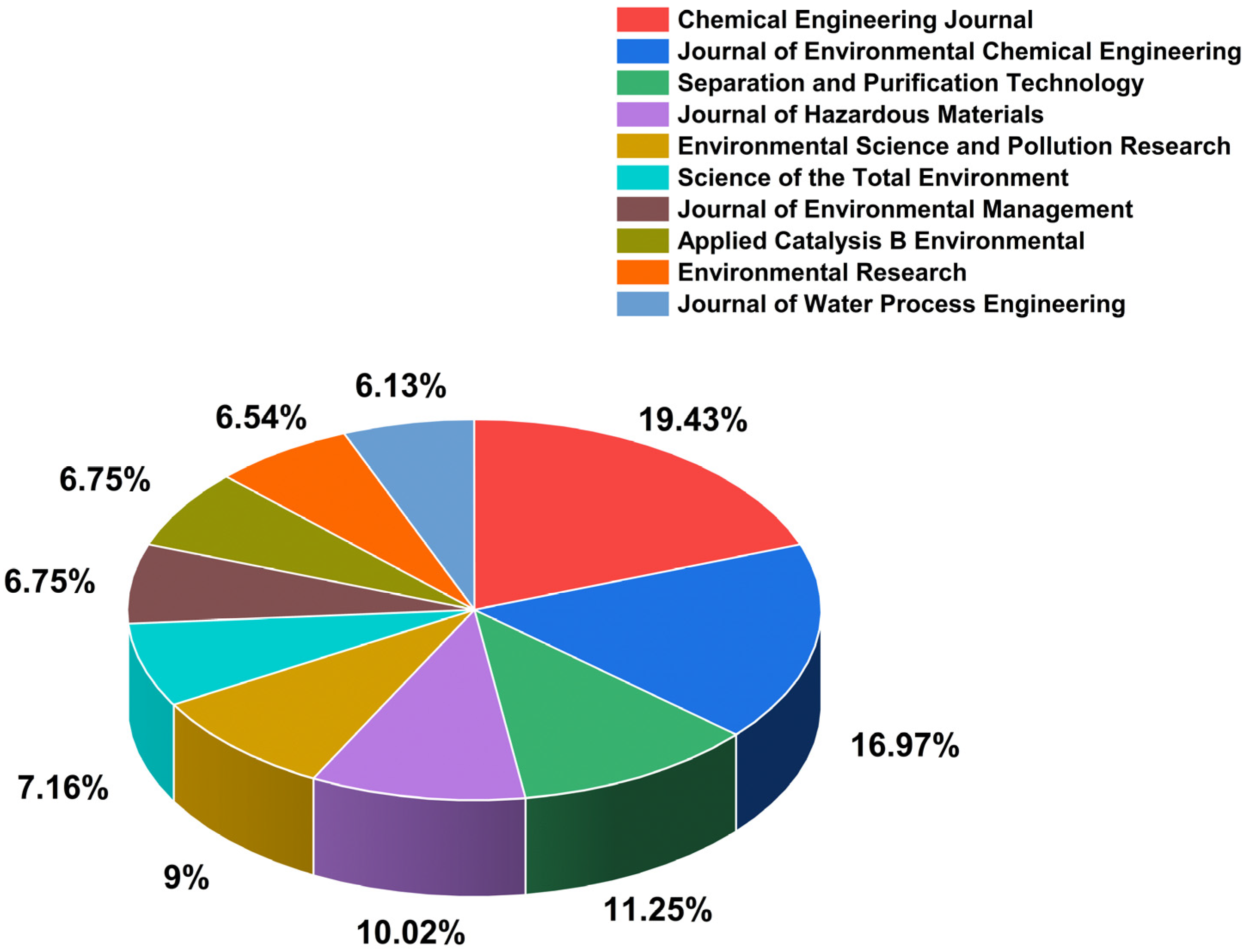 Beyond the top-tier outlets, the presence of journals such as Environmental Science and Pollution Research (44), Science of the Total Environment (35), and Journal of Environmental Management (33) highlights the growing integration of catalytic degradation research with environmental risk assessment, sustainability, and policy-relevant applications. Notably, Applied Catalysis B: Environmental (33) serves as a key platform for fundamental studies on catalytic mechanisms and advanced oxidation pathways, bridging basic catalysis science with environmental implementation. The inclusion of Environmental Research (32) and Journal of Water Process Engineering (30) reflects increasing attention to real-water matrices, process scalability, and engineering feasibility. The source distribution illustrates a mature and interdisciplinary publication ecosystem, where advances in catalytic degradation are disseminated through journals spanning catalysis, environmental chemistry, and water engineering, thereby facilitating broad scientific visibility and cross-disciplinary knowledge transfer.