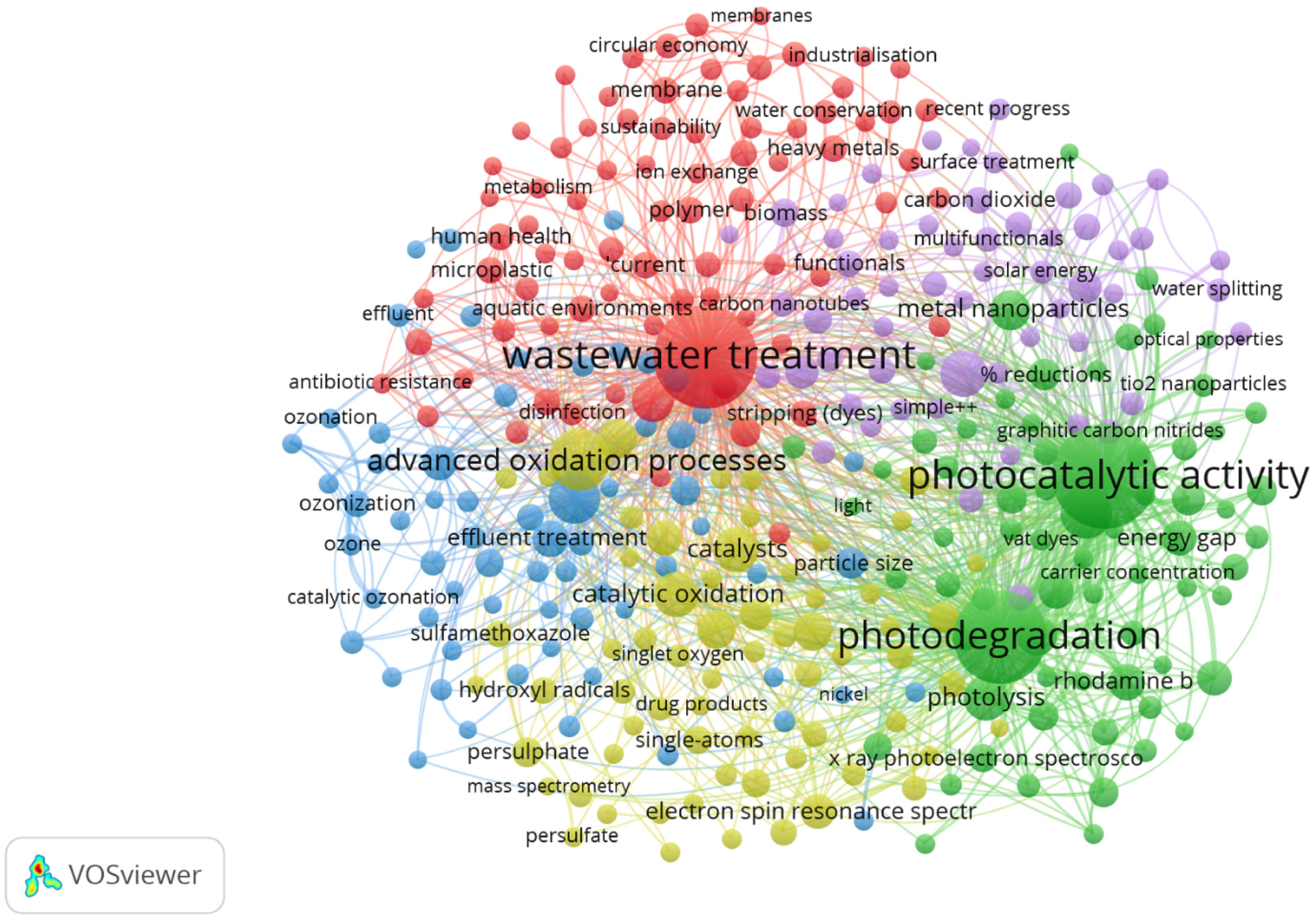 Catalytic degradation “OR” photocatalytic degradation “OR” advanced oxidation process * “OR” catalytic oxidation “AND” water treatment “AND” wastewater treatment “ AND “ water remediation AND PUBYEAR > 2010 AND PUBYEAR < 2025 AND (LIMIT-TO (DOCTYPE, “ar”) OR LIMIT-TO (DOCTYPE, “re”)) AND (LIMIT-TO (LANGUAGE, “English”)) AND (EXCLUDE (SUBJAREA, “DECI”) OR EXCLUDE (SUBJAREA, “DENT”) OR EXCLUDE (SUBJAREA, “NEUR”) OR EXCLUDE (SUBJAREA, “NURS”) OR EXCLUDE (SUBJAREA, “PSYC”) OR EXCLUDE (SUBJAREA, “HEAL”) OR EXCLUDE (SUBJAREA, “ECON”) OR EXCLUDE (SUBJAREA, “MATH”) OR EXCLUDE (SUBJAREA, “IMMU”) OR EXCLUDE (SUBJAREA, “EART”) OR EXCLUDE (SUBJAREA, “COMP”) OR EXCLUDE (SUBJAREA, “MULT”) OR EXCLUDE (SUBJAREA, “BUSI”) OR EXCLUDE (SUBJAREA, “SOCI”) OR EXCLUDE (SUBJAREA, “PHAR”)