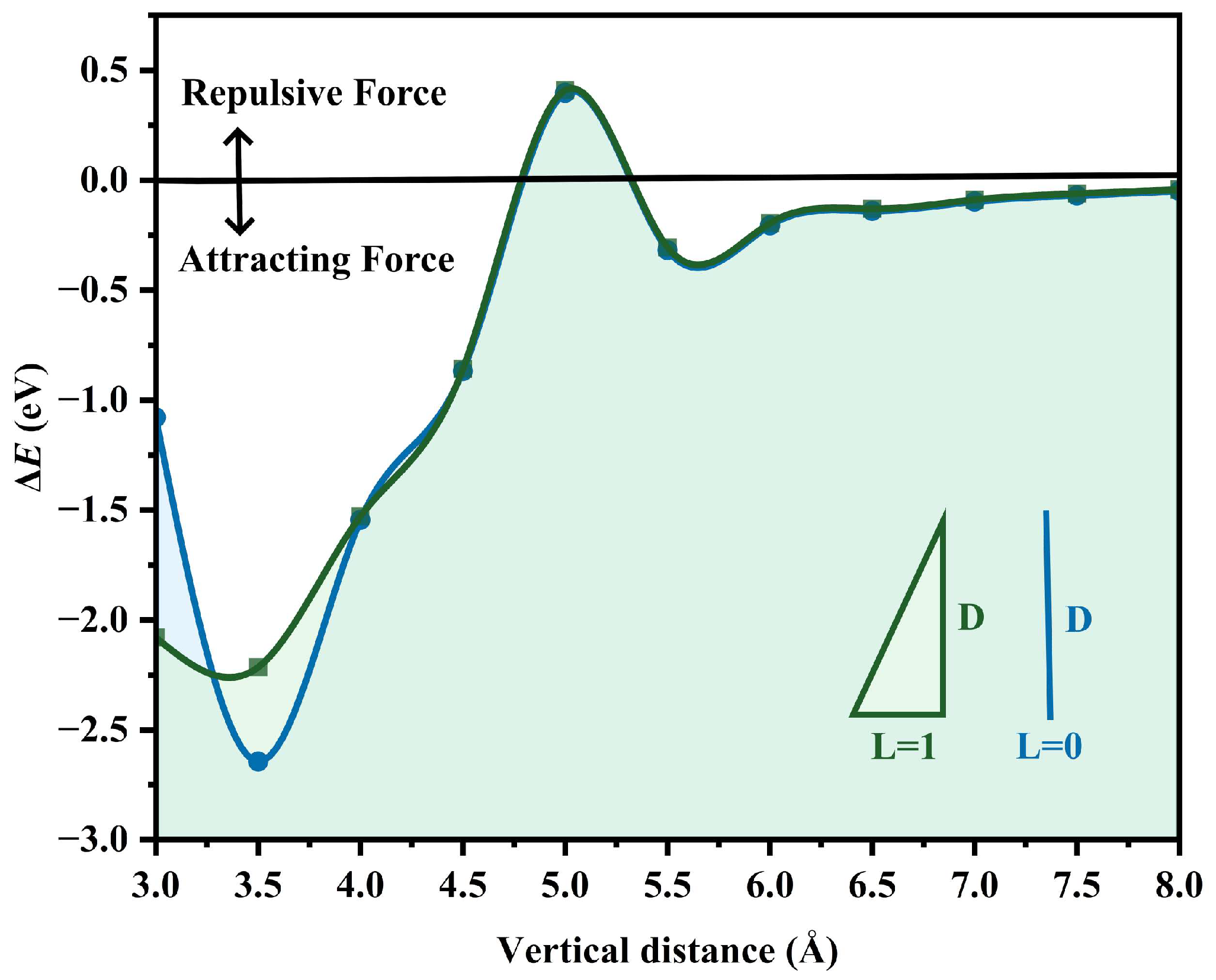 - Repulsive force range (D = ~5 Å): Along with the continuous elongation of D, ΔE undergoes a process of first increasing and then decreasing, resulting in a repulsive range of D = ~5 Å.