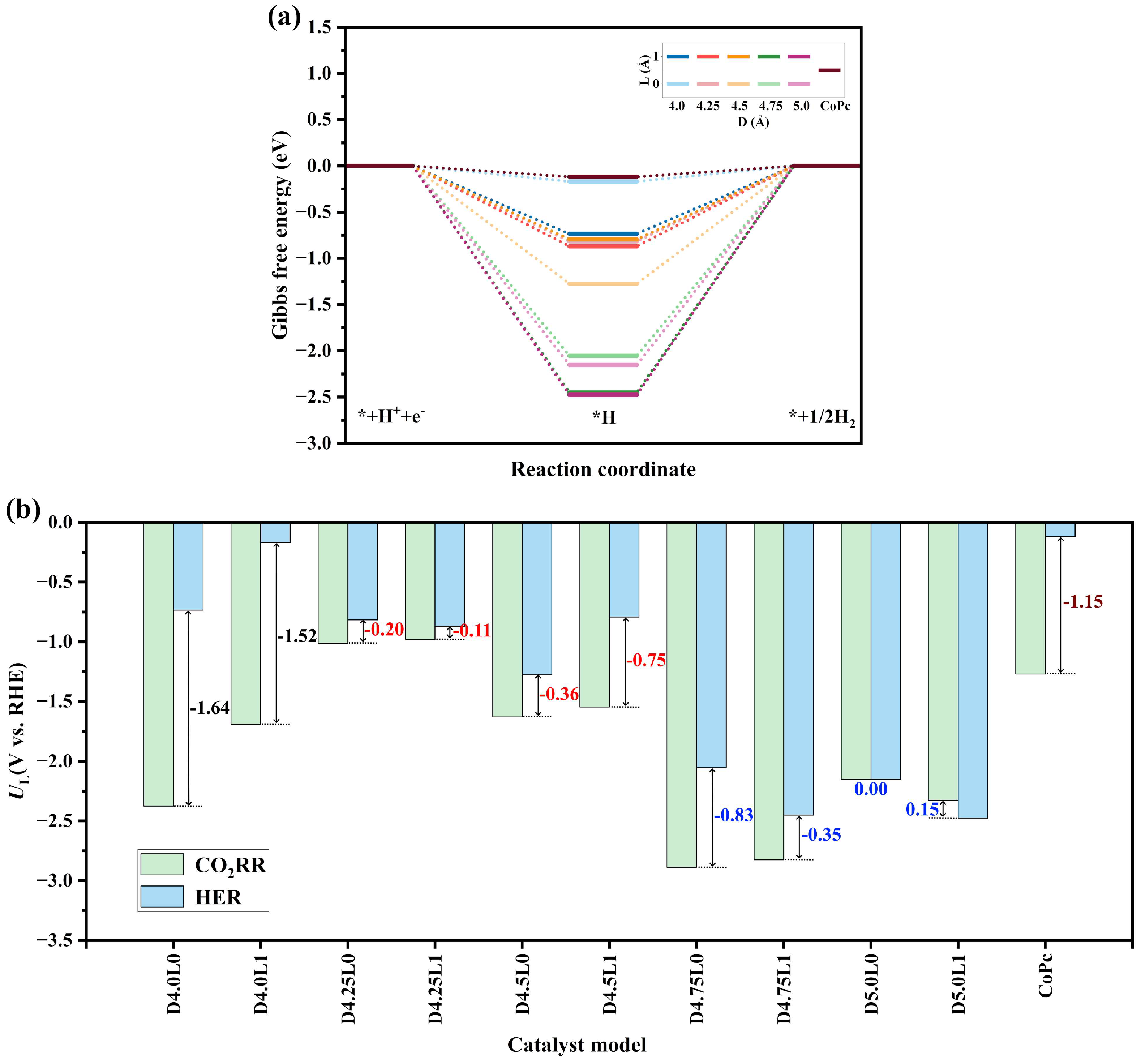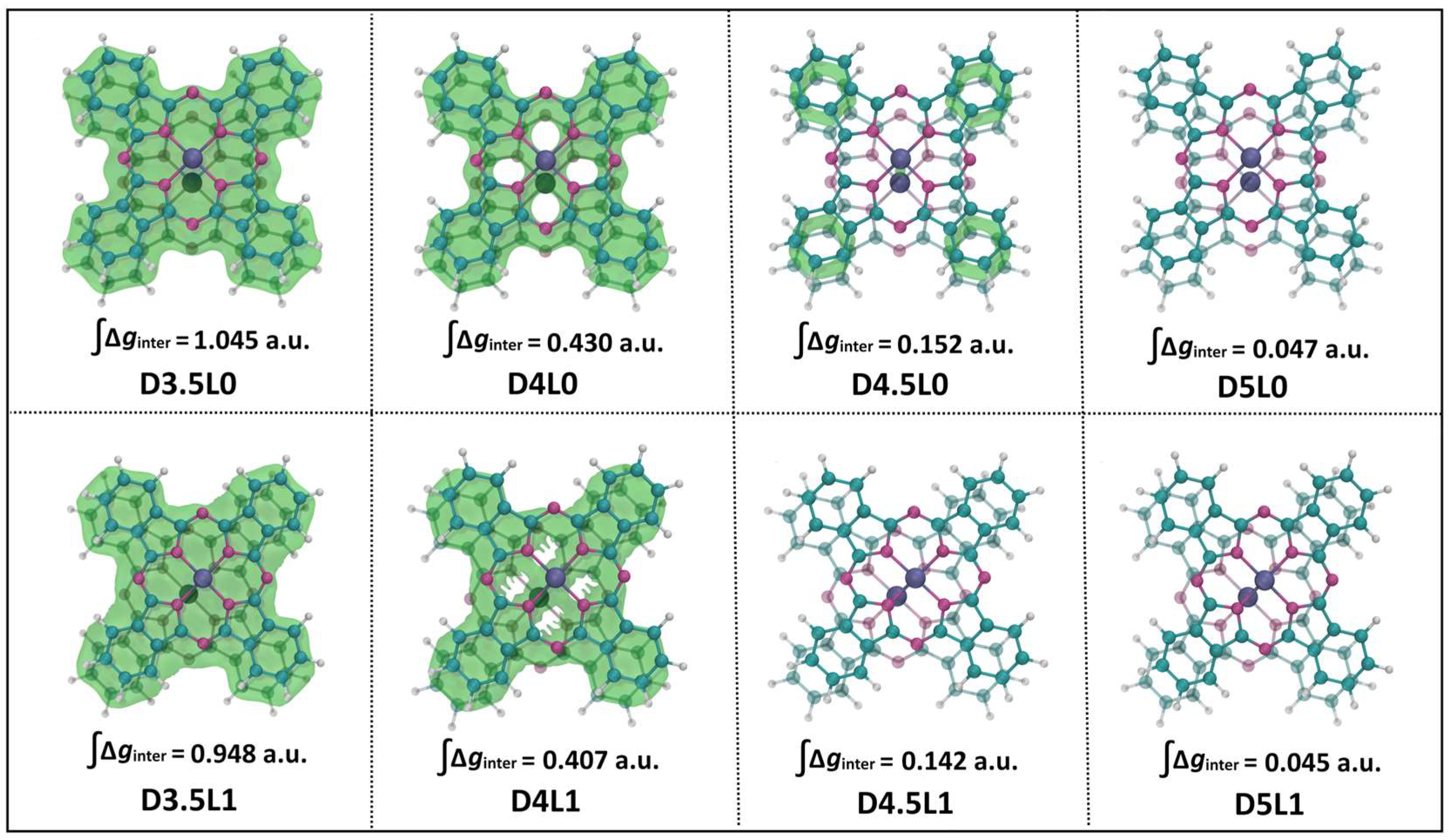 - Attracting force range (D = 3.0–4.5 Å): Within this range, the negative ΔE confirms an attracting force between the two CoPc layers. The system reaches its thermodynamic minimum of −2.64 eV at D = 3.5 Å (L = 0 Å). But here we must remind all the readers that, although D = 3.5 Å performs best in stability, the space between Co-Co catalyzing sites is too narrow to accommodate CO2 molecules, which brings great hindrance to the interlayer catalyzing processes. This difficulty is directly emphasized in the subsequent discussions of the present article.