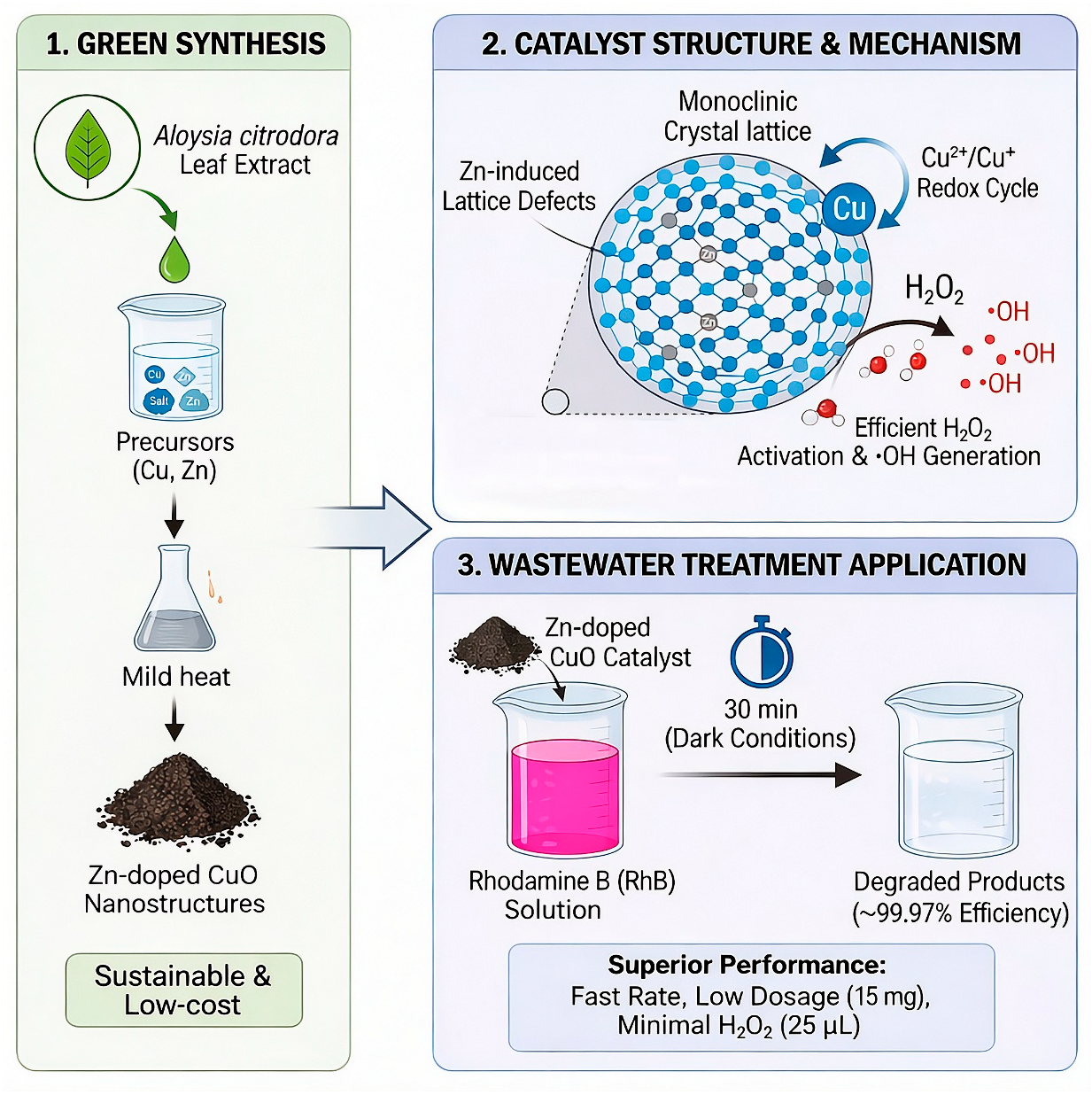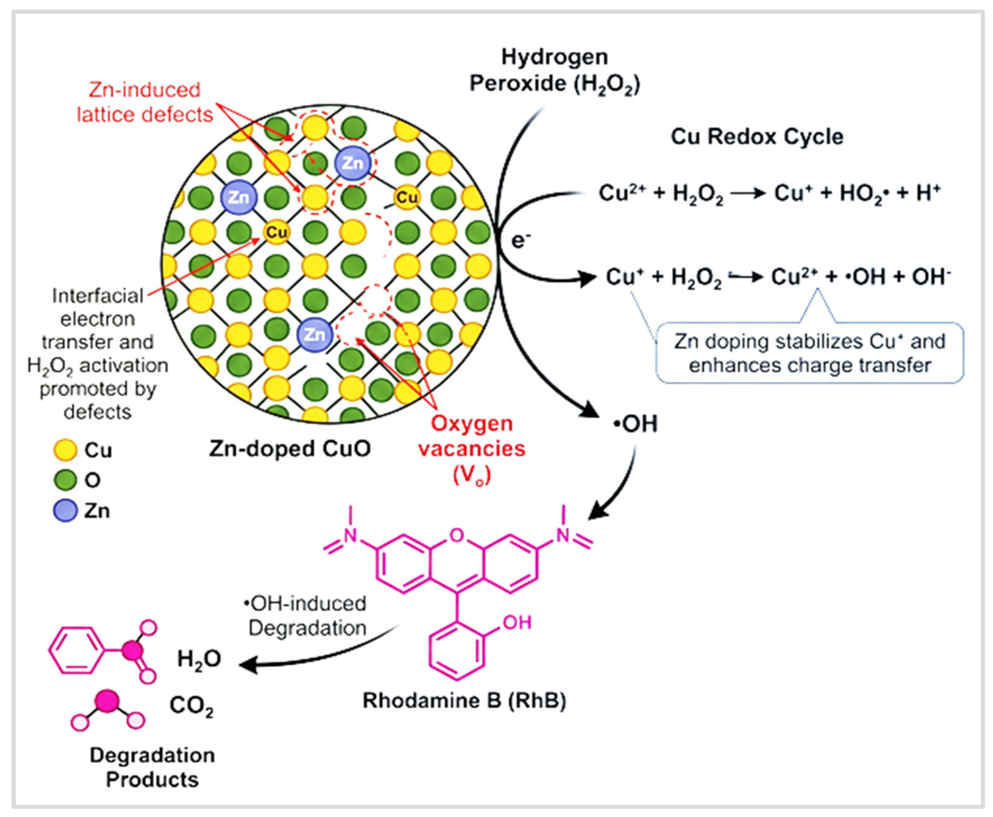 | Zn-doped CuO | Green synthesis (Aloysia citrodora) | Heterogeneous Fenton-like (dark) | 30 | 0.6 g/L | 25 µL | ~99.97% Rhodamine B | This work |