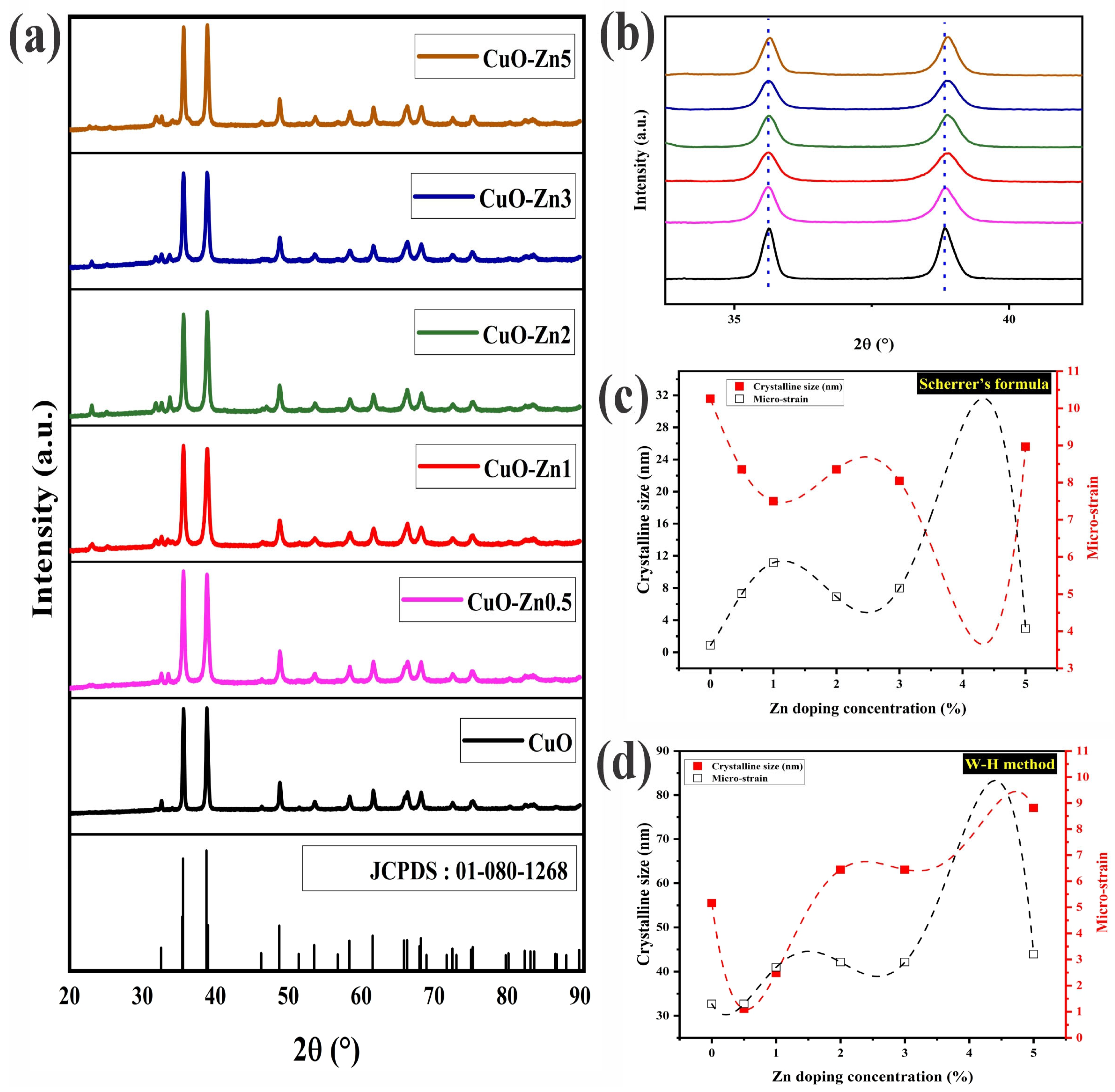 - Goyal, C.P.; Goyal, D.; K. Rajan, S.; Ramgir, N.S.; Shimura, Y.; Navaneethan, M.; Hayakawa, Y.; Muthamizhchelvan, C.; Ikeda, H.; Ponnusamy, S. Effect of Zn Doping in CuO Octahedral Crystals towards Structural, Optical, and Gas Sensing Properties. Crystals 2020, 10, 188. [Google Scholar] [CrossRef]