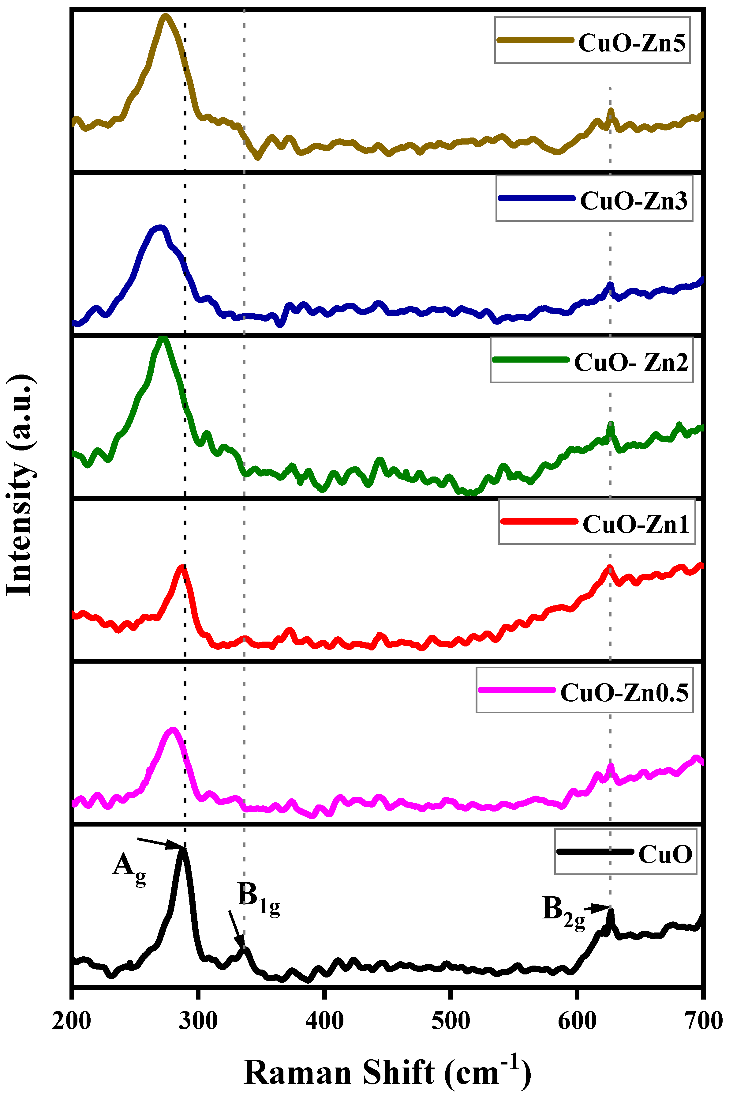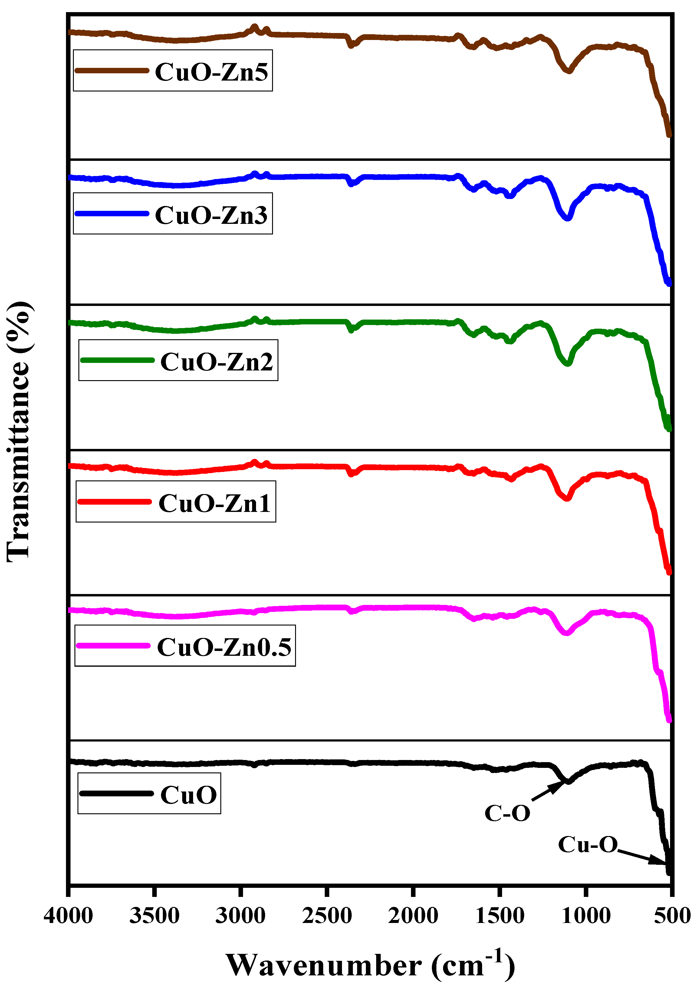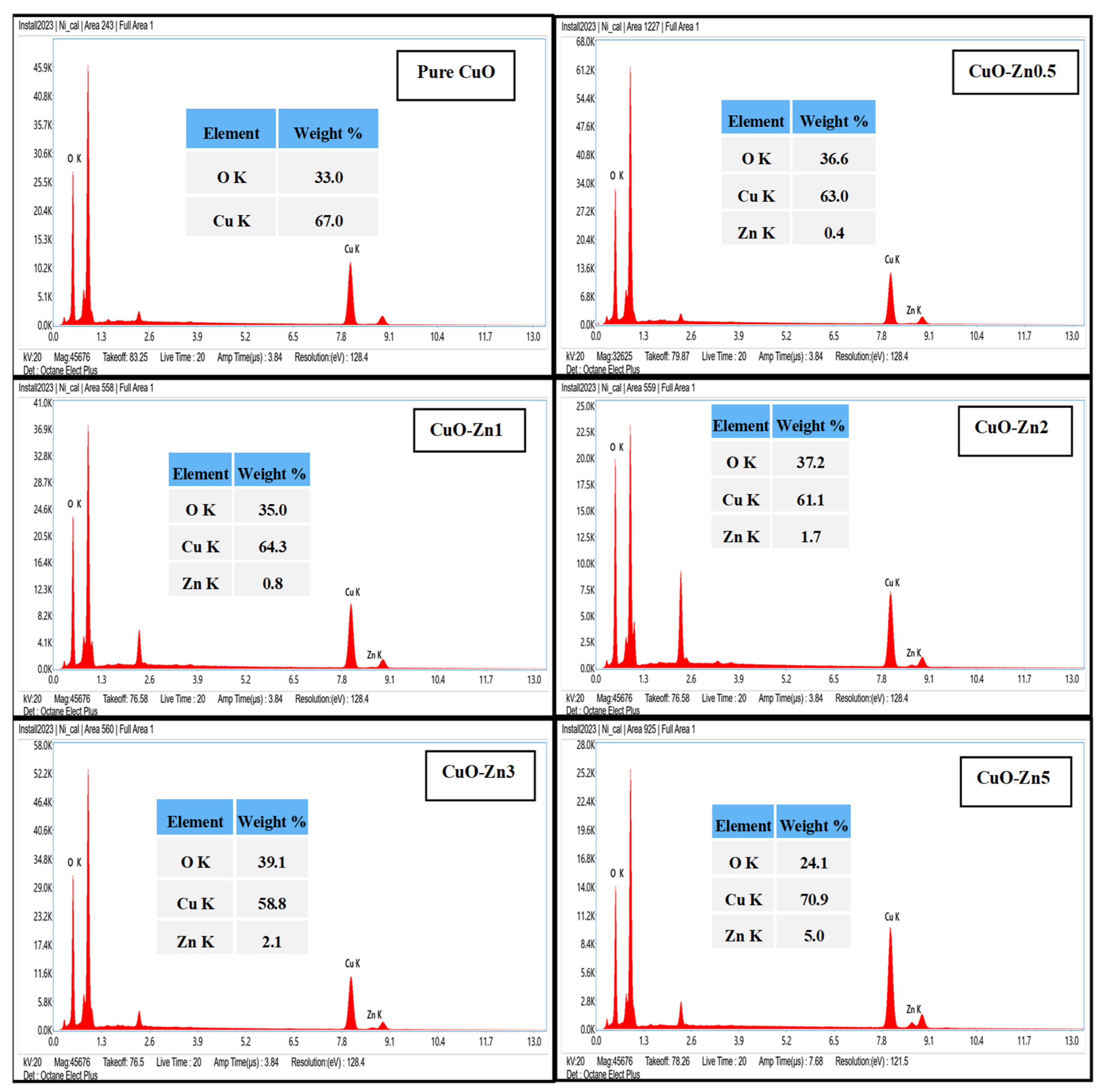 | Property | CuO | CuO-Zn0.5 | CuO-Zn1 | CuO-Zn2 | CuO-Zn3 | CuO-Zn5 |
