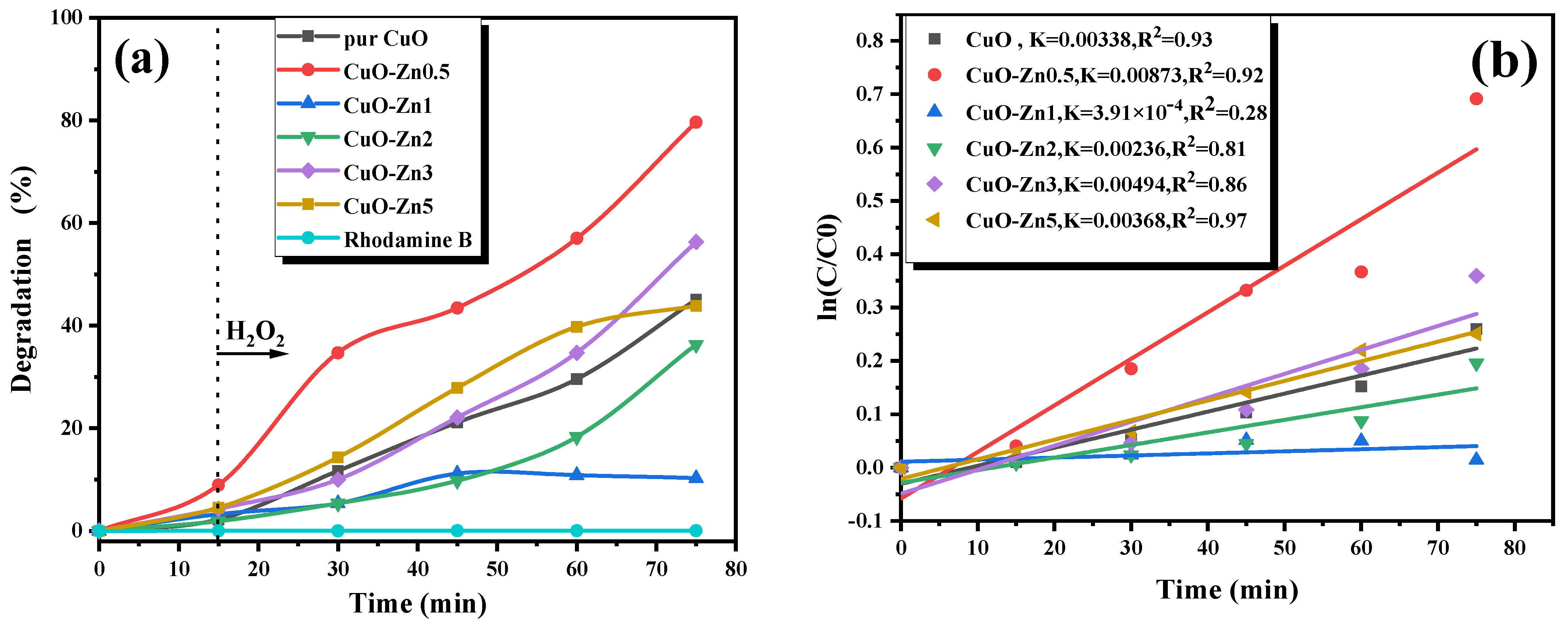 3.4. Degradation of Rhodamine B by Pure and Zn-Doped CuO