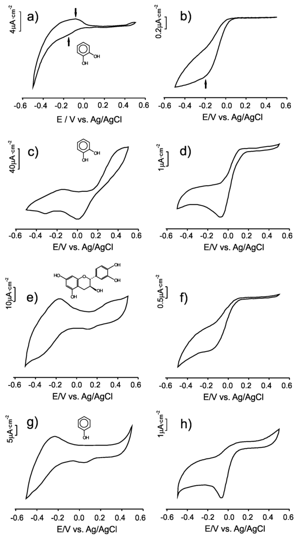 The response of the biosensors towards other phenolic compounds including catechin (Figure 1e,f) and phenol (Figure 1g,h) has also been studied. As observed in the figure, tyrosinase is able to use mono, di- and polyhydroxyphenols as substrates, but the affinity depends on the nature of the phenolic species.