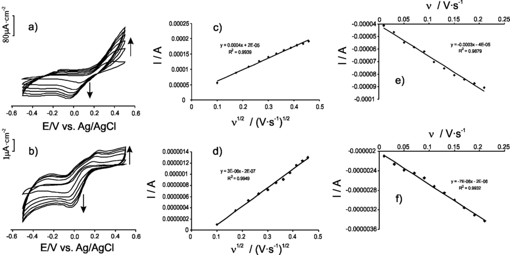 where Ipa is the anodic peak current (Ampere), n is the number of electrons involved in the redox process, ν is the potential scan rate (V × s−1), D is the diffusion coefficient (cm2 × s−1), A is the electrode surface area (cm2), and C is the concentration (mM). From the slope of Ia vs. v1/2 plot, the diffusion coefficient D could be calculated (Table 2).
