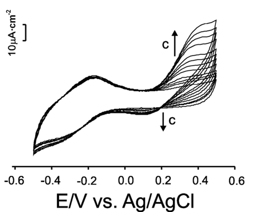 Cyclic voltammograms of a Ty/LuPc2-LB electrode immersed in catechin solutions (from 10μM to 40mM). Scan rate 0.05 V × s−1.