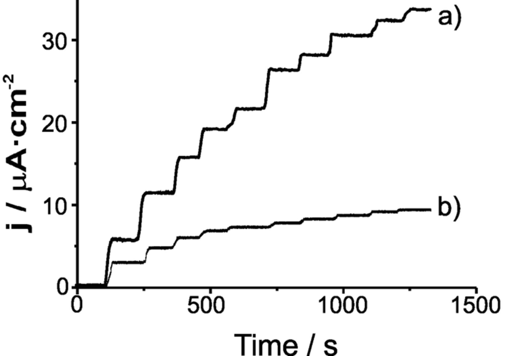 Amperometric response of (a) Ty/LuPc2-LB and (b) Ty/LuPc2-CPE electrodes to phenol in 0.01 M PBS solution (pH = 7) with concentration increments of 20μM.