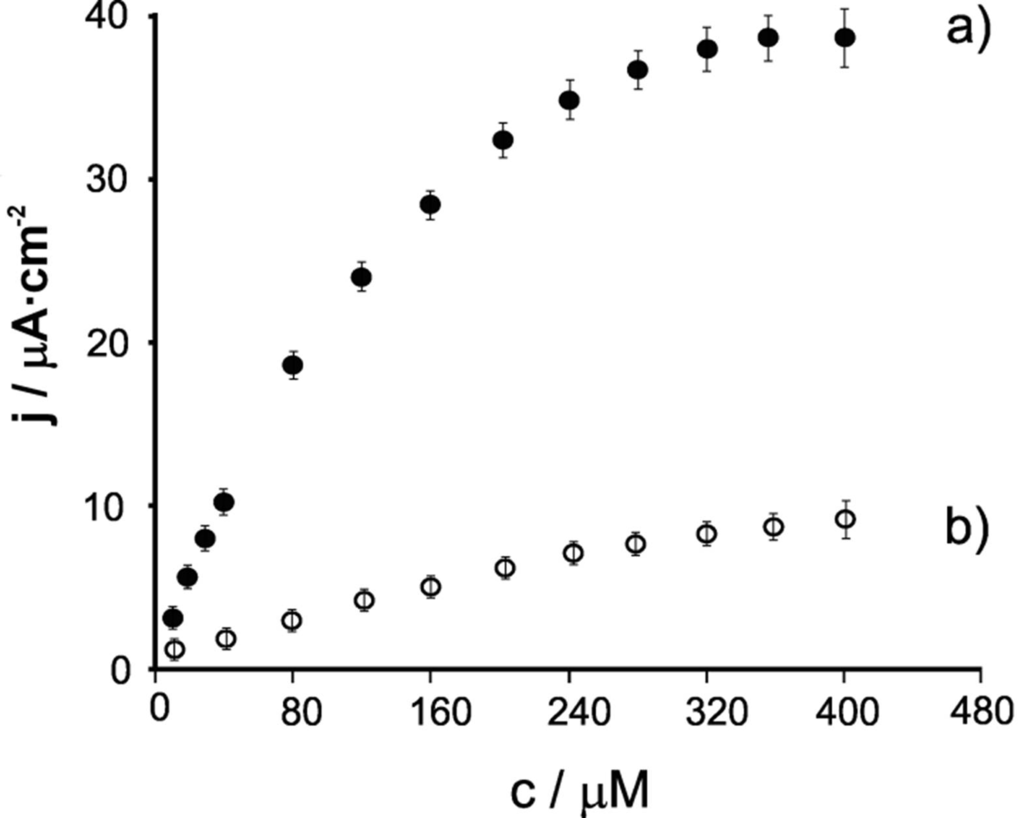 As observed in the Table, the Ty/LuPc2-LB biosensors showed higher surface coverage values (Γ) than CPEs, indicating that the number of active sites is superior in the nanostructured LB thin films than in the carbon-based matrix sensors. From this data it can be deduced that nanostructured sensors show an improvement of the enzymatic activity which is related to the higher surface area provided by the nanostructured environment and to the preservation of the enzymatic activity in the biomimetic environment.