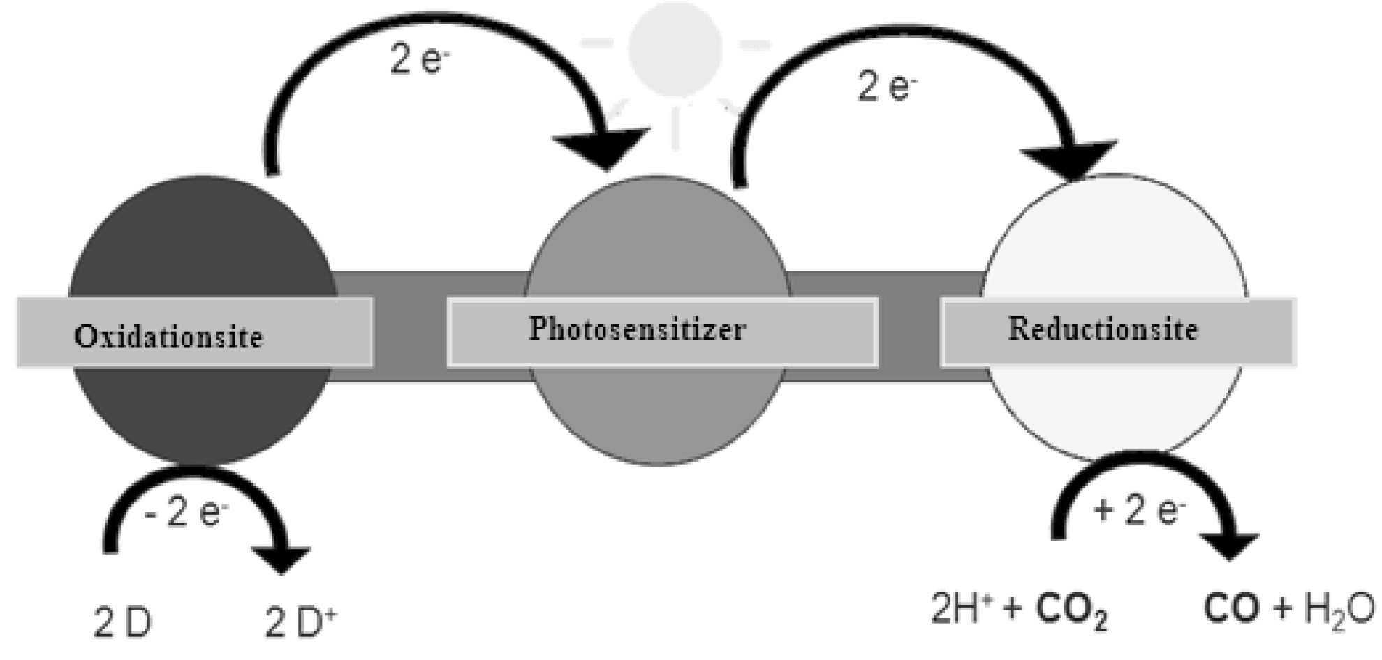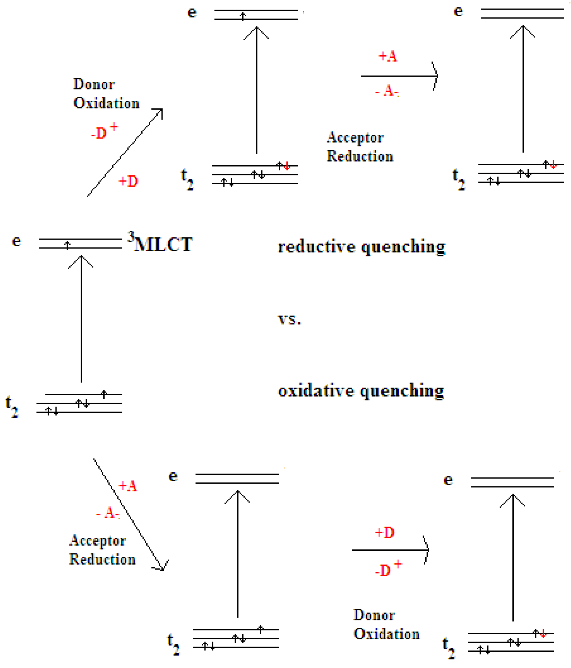 However, in terms of CO2 reduction, reductive quenching is the more important process. With an electron that is provided from the oxidation site, a ground state of the one-electron reduced species is formed, which is capable of transferring one electron to the reduction site to recover the d6 neutral ground state of the photosensitizer (Figure 3) [13,14,15].