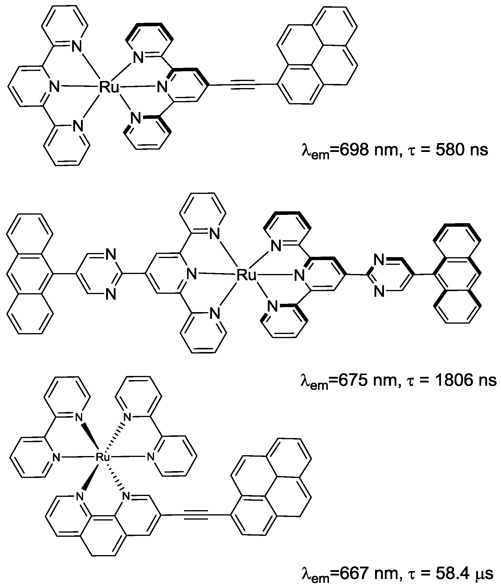 The excited state lifetime is dependent on the radiative and nonradiative rate constants of the relaxation process. In the weakly emitting Ru(II) polypyridine complexes the nonradiative decay constant is the more important factor [30]. Beside direct contributions from the ground state, this nonradiative decay can be reached via a thermally accessible metal-centered state (3MC). Lowering the energy of the 3MLCT state reduces the accessibility of this 3MC state, but increases the direct contribution of the ground state according to the energy gap law [31,32]. Synthetic strategies to prolong this lifetime have already been discussed. [29,33]. For example, by introduction of electron withdrawing substituents (e.g., SO2Me) [34], or acetylene groups [35], lifetimes of the 3MLCT state up to 580 ns were found, due to the lowering of the 3MLCT energy which reduces the population of the 3MC state. However, the most successful strategy to extend the lifetime of the excited state is to equilibrate the emissive 3MLCT state with a nonemissive triplet state [36]. The ruthenium(II) complex bearing a terpyridine-pyrimidyl-anthranyl ligand reached two lifetimes for the decay of the excited states of 9 ns and 1806 ns [37]. Utilizing similar strategies the lifetime of Ru(II) bipyridine complexes can also be extended reaching lifetimes of up to 58.4 µs in CH3CN (Figure 4).